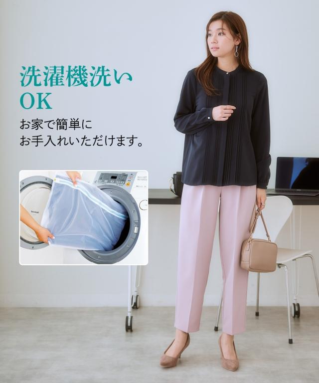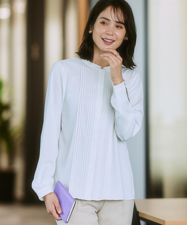 【繊細なピンタックが美しいブラウス】控えめな一粒ボタンがかえっておしゃれな存在感に。上品さが欲しい日に選んで。 ■ポイント ・滑らかでとろみのあるトレッチパウダーサテンシリーズのピンタックブラウス。 ・オフィスモニターさんも太鼓判。 ■デザイン ・繊細なピンタックが大人っぽい雰囲気を醸し出すシンプルデザイン。 ・バンドカラーにメタルボタンがポイント。 ■素材 ・働く女性の毎日をサポートする「しわになりにくい、速乾、洗濯機OK、UVカット」の優秀機能素材。 ・光沢感とストレッチ感のあるパウダーサテン生地。 ・UVカット機能付き。 ■おすすめのスタイリング ・ウエストをインしてスカートと合わせればデイリーなオフィススタイルが完成。 ・ややカジュアルなボトムもよく似合うのでオフスタイルにも重宝。 〜7days Life Styling〜 仕事の日、休日、イベントの日まで、 働く女性の毎日を商品やコンテンツを通して、 自分らしく快適でいられる“働く服改革”をサポートします。