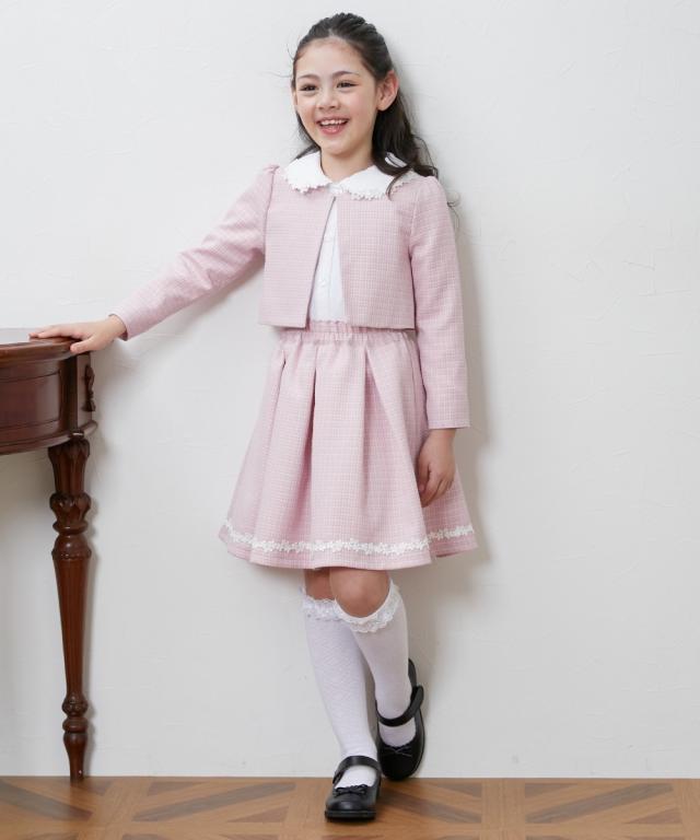 卒園式や入学式、冠婚葬祭におすすめ。 ツイード風素材のワンピースにブラウス・ボレロをセット。フォーマルウェアアンサンブルセット コサージュもセットになっていて、ピンで着脱可能 ■デザイン ・フォーマルシーンにピッタリのツイード風の立体感のある素材のワンピース&ボレロのセットアップ ・白い丸衿ブラウスがカワイイ&上品さをプラス ・スカート裾とブラウス衿のレースが ・しっかりした生地感で、シルエットもばっちり決まる ■素材 ・しっかりとした上質な素材