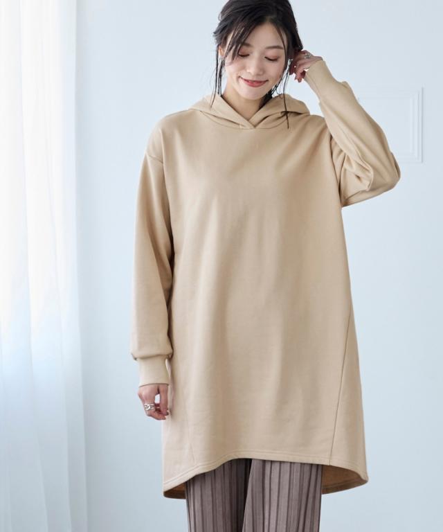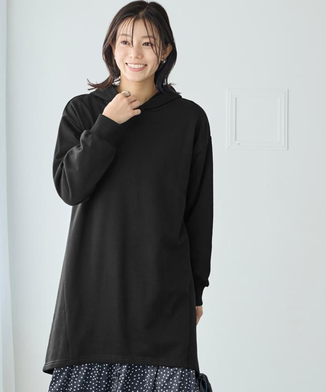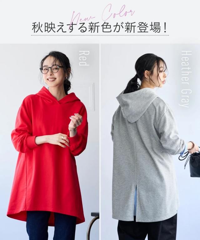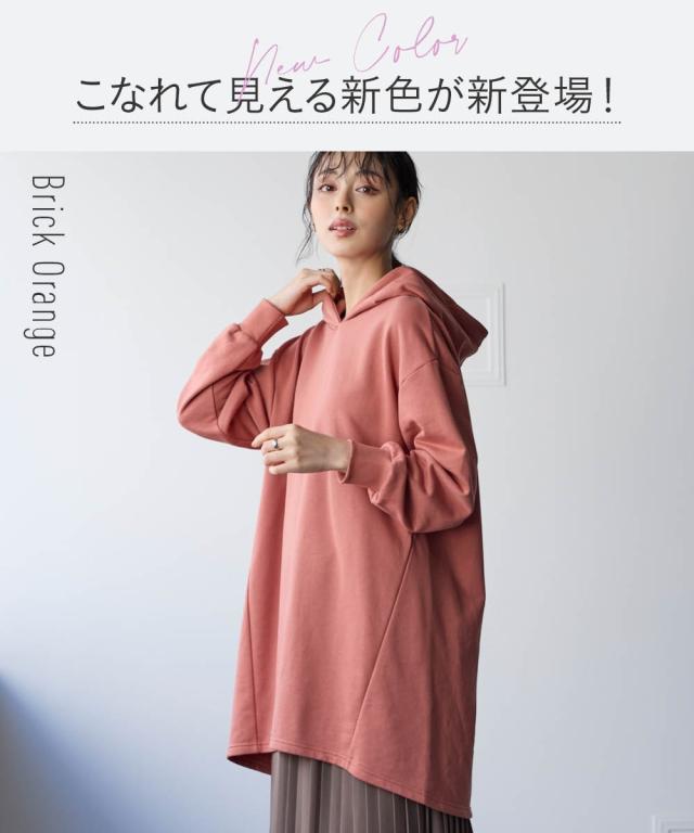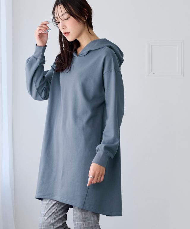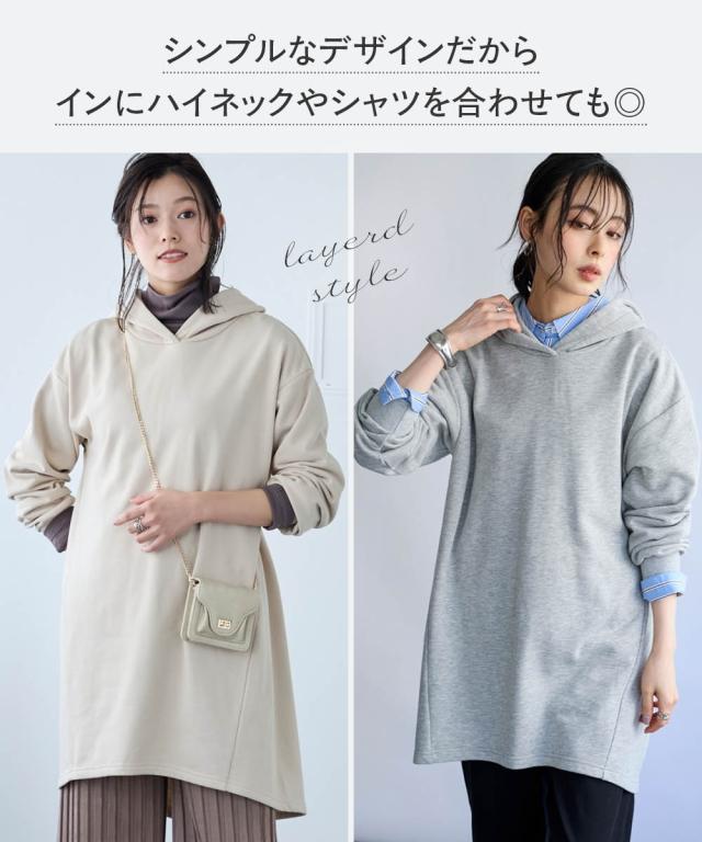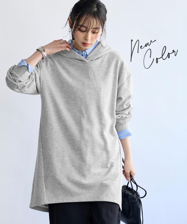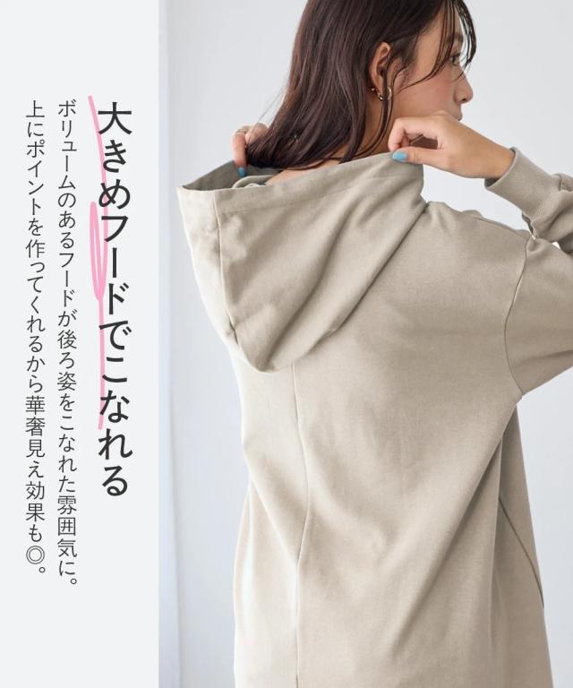 綿100%の肌触りと気になるところをしっかり隠しつつカッティングでスッキリ見える優秀チュニック。 ■デザイン シンプルなデザインで飽きがこず長く使えます。すこしゆるいシルエットなので着ていて楽です。後ろが長めになっているので気になるお尻周りをしっかりカバーしてくれます。前から後ろへ流れる斜めのラインと後ろスリットで重たくなくスッキリ見せてくれます。大きめのフードがポイントになってバックスタイルを小さくみせてくれます。 ■素材 厚すぎないスェット素材で夏以外、使えます。肌触りの良い安心の綿100%素材です。柔軟加工しているのでチクチクガサガサしにくく柔らか。 ■おすすめのスタイリング 細身のパンツと合わせても可愛いですし、フレアボトムと合わせてもズルユルっとして可愛いです。寒い時は中にタートルニットやシャツを合わせてもかわいくおすすめです。