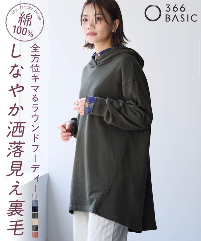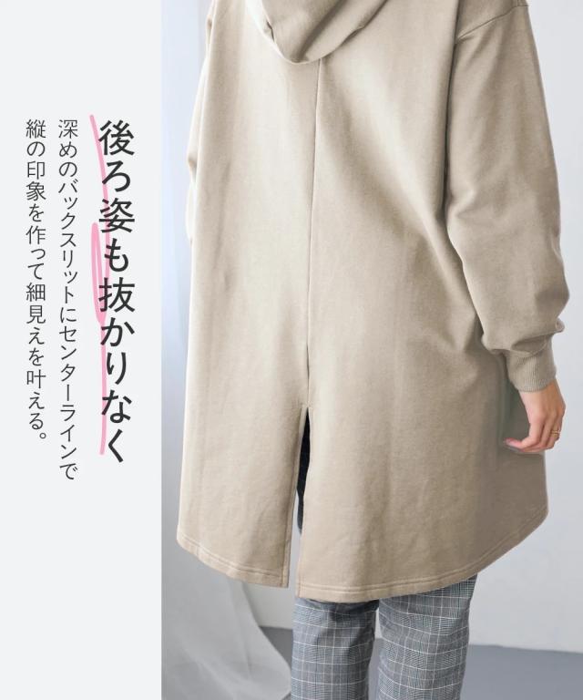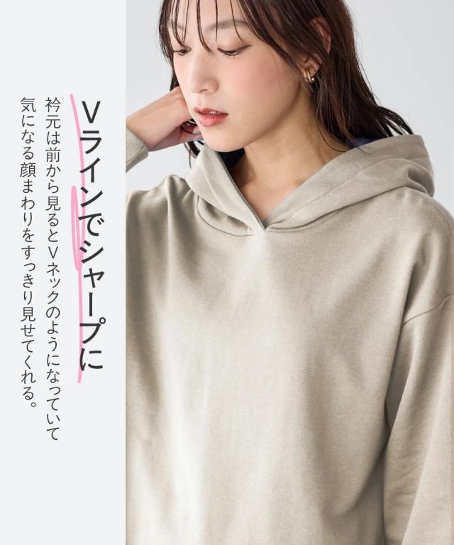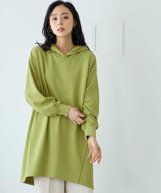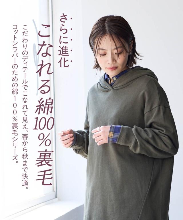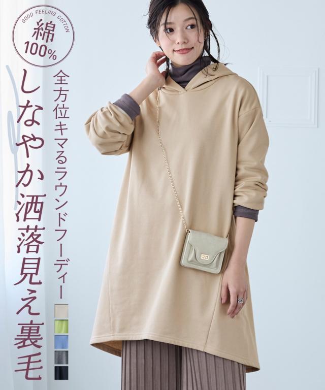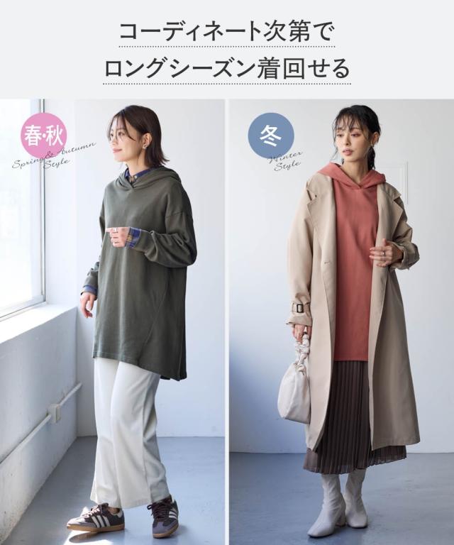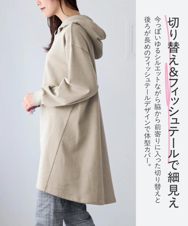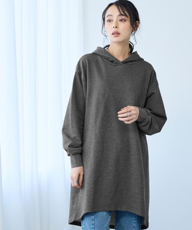 綿100%の肌触りと気になるところをしっかり隠しつつカッティングでスッキリ見える優秀チュニック。 ■デザイン シンプルなデザインで飽きがこず長く使えます。すこしゆるいシルエットなので着ていて楽です。後ろが長めになっているので気になるお尻周りをしっかりカバーしてくれます。前から後ろへ流れる斜めのラインと後ろスリットで重たくなくスッキリ見せてくれます。大きめのフードがポイントになってバックスタイルを小さくみせてくれます。 ■素材 厚すぎないスェット素材で夏以外、使えます。肌触りの良い安心の綿100%素材です。柔軟加工しているのでチクチクガサガサしにくく柔らか。 ■おすすめのスタイリング 細身のパンツと合わせても可愛いですし、フレアボトムと合わせてもズルユルっとして可愛いです。寒い時は中にタートルニットやシャツを合わせてもかわいくおすすめです。