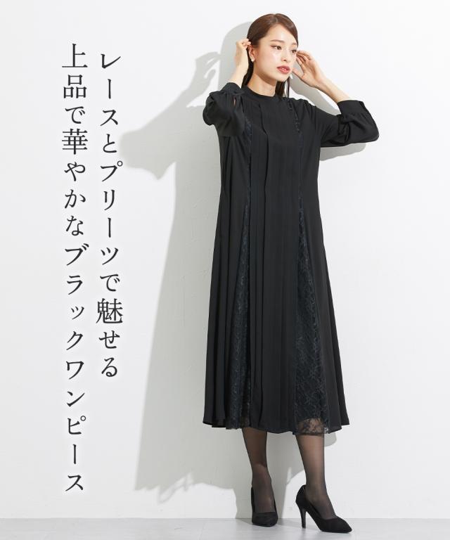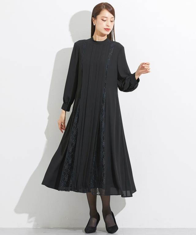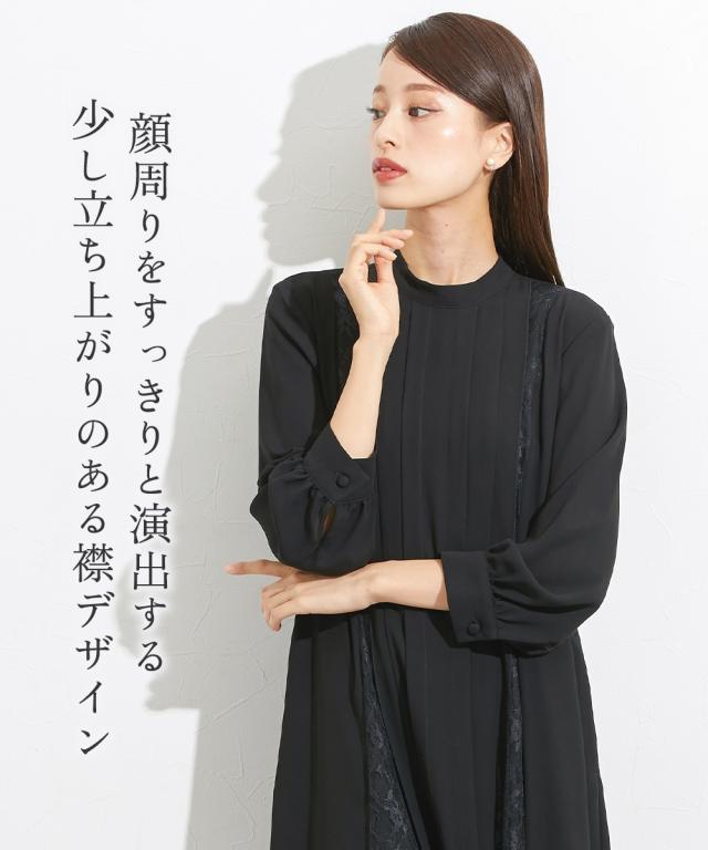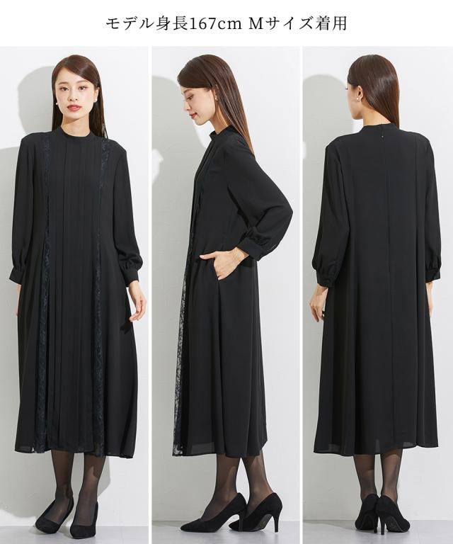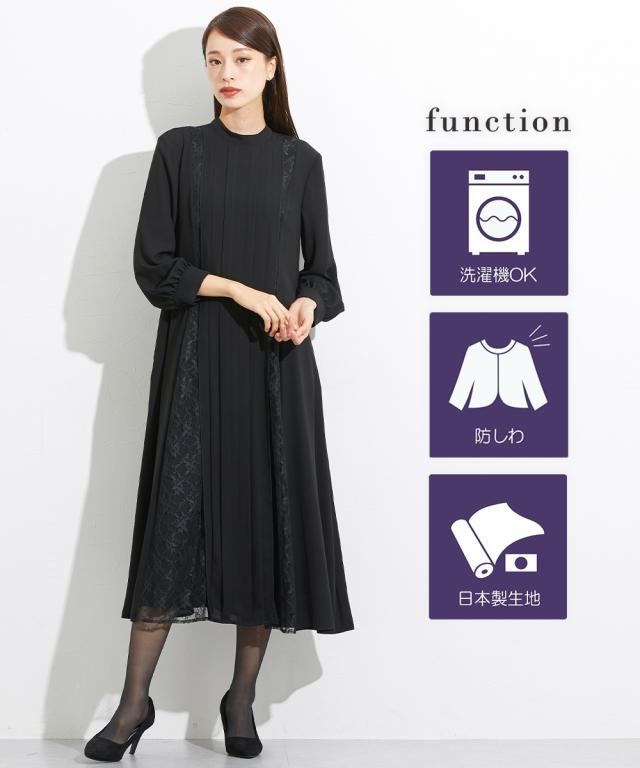喪服 礼服 ブラックフォーマル ワンピース レディース 日本製生地使用 洗える防しわスタンド カラー レース 切替 デザイン 有 〔Callarus〕 M/L ニッセン nissen