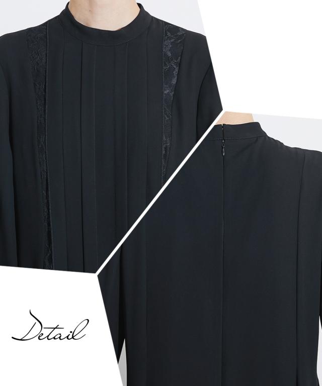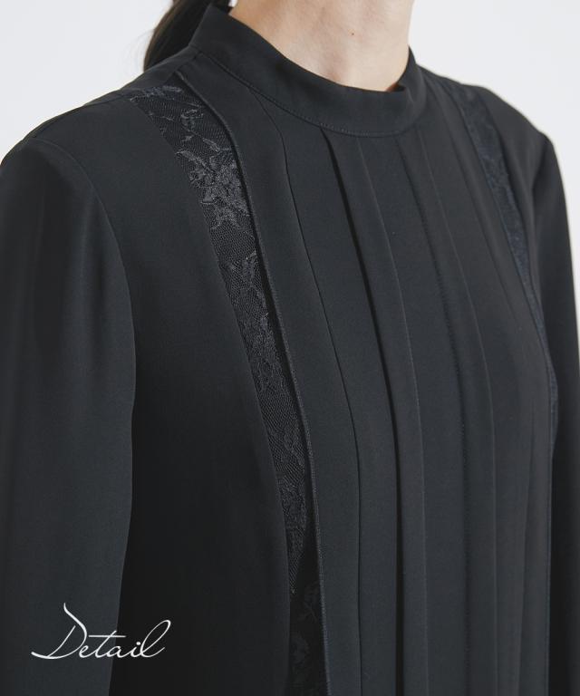 【Callarus(カラルス)】〜for Black Formal〜 まっすぐブレない美しさで人々を魅了する花“calla lily”と ラテン語で輝くという意味の“clarus”を合わせた造語がブランド名の由来です。 <自分らしく上品で美しい装いを大切にする方へ> 縛られたカタチではなく、「想い」が人と人をつなぐ シーンにもテイストにも年齢にも縛られない自由な着こなしを実現する新しいブラックフォーマル。 こだわりポイント 上品かつ美しく大切な日を装う。シーンを選ばないという 今までにない価値観に基づいた新しいブラックフォーマル ワンピースフロント部分の上品なレースを使用。大人の上品な装いを演出 襟元はスタンドカラー仕様で、スタイリッシュな印象に レースとフロントプリーツデザインで、縦方向にきれいな流れを演出 生地は日本製ジョーゼット生地を使用 ブラックフォーマル生地(漆黒)を使用、きちんと感のある装いに 防しわ生地で、しわになりにくい。 洗濯機(ネット使用)で洗えるので、お手入れ楽チン。ご家庭でお手入れができます。 喪服・礼服としてだけでなく、結婚式・参観日・卒業式などすべてのフォーマルシーンに対応できるワンピースです。