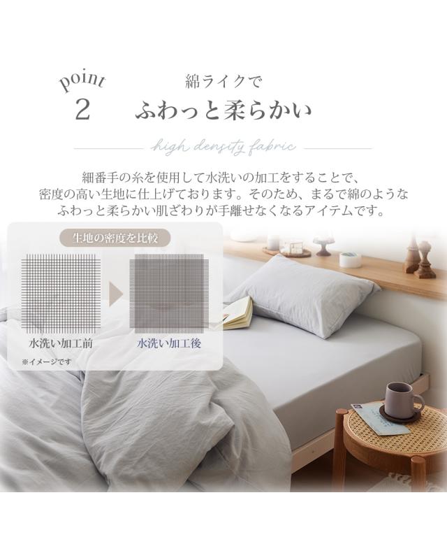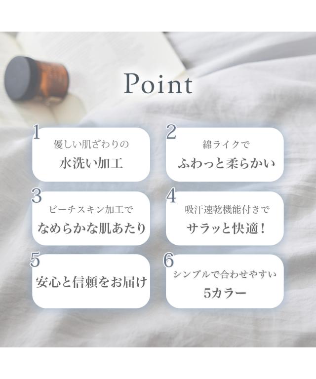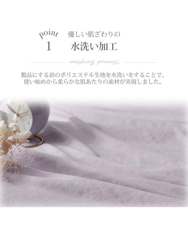 水洗い加工を施すことで、繊維を柔らかく仕上げ、滑らかで柔らかい肌触りを実現しました。ピーチスキン加工を施しており、生地の表面に桃(ピーチ)のような短い毛羽をつくり、しっとりなめらかな肌触りに仕上げました。また、吸汗速乾性に優れた素材を使用しているため、汗ばむ季節もサラッと快適。年中快適にご使用頂けるシリーズです。非常にお買い得価格ながらも、色と素材に拘った水洗い加工寝具です。是非お手に取っていただけたら嬉しいです。●種類【掛け布団カバー】掛け布団カバーとは、掛け布団を包んで取り付けるカバーで、布団本体の汚れ防止や劣化を防止する目的があります。また、快適で心地よい空間にするために、お気に入りの素材デザインを見つけ季節に合わせて楽しむインテリア要素もあります。●色展開4色展開。ラベンダー・アイスブルー・アイボリー・グレージュの4色展開です。優しいお色味で寝室を明るくコーディネートしてくれる4色でおとどけいたします。●サイズ展開シングルとダブルの2サイズ展開でご用意しています。●お手入れ方法洗濯機で丸洗い可能 気兼ねなく洗濯をすることで、いつでも清潔にお使いいただけます。