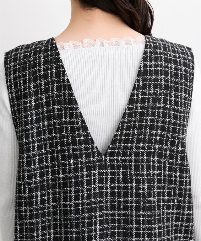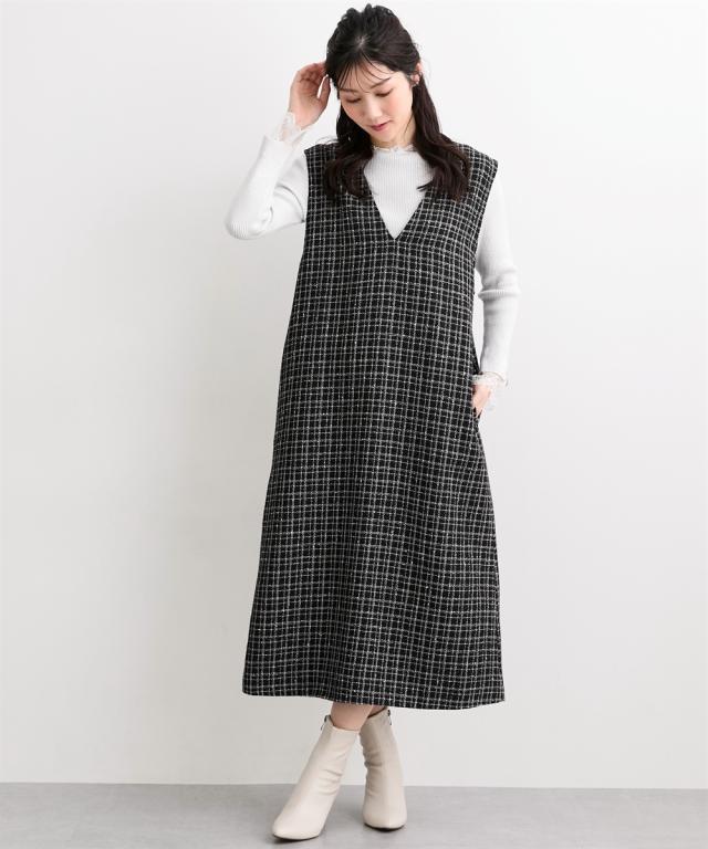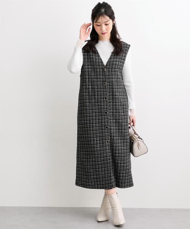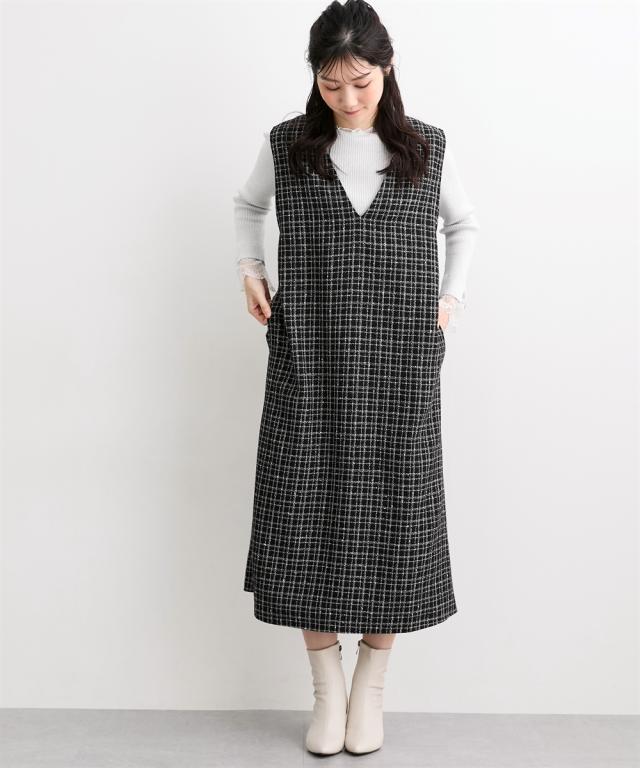 【Hana服】時を重ねて輝く女性のための大人ファッション 3Wayの着方が楽しめるジャンパースカート ■デザイン ・ワンピースでもジレでも着用できる仕様に。 ・ジレも小顔にみえるようにVのサイズ設計にこだわりました。 ・気になる部分が見えない、着痩せを叶えるAラインシルエット。 ・着心地にもこだわり、なるべく重量感を感じさせない生地を選定しています。 ■素材 ラメ糸がおしゃれなツイード調素材。 ■おすすめのスタイリング ワンピースやボトムスにさらっとジレを合わせるスタイリングがおすすめです