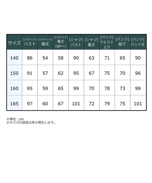 品質:[ジャケット]表生地:ポリエステル100%(織物) 裏生地:ポリエステル100%(総裏) [シャツ]ポリエステル65%・綿35%(織物)[パンツ]ポリエステル100%(織物) [ネクタイ]ポリエステル100% 柄の出方が多少異なる場合があります 透け感:[ジャケット・パンツ]なし [シャツ]ややあり ※インナーの着用をおすすめします。 伸縮性:なし 生地の厚み:普通 ポケット:[ジャケット]前2・胸1 [パンツ]前2 [シャツ]胸1 ウエスト:ウエスト調節ゴム入り [ポケットチーフ]取り外し可 [ネクタイ]取り外し可 季節:春・秋向き シルエット:普通 原産国:[ジャケット・シャツ・パンツ]ベトナム製 [ネクタイ]中国製 備考:[ジャケット・パンツ]ドライ [シャツ]洗濯機OK