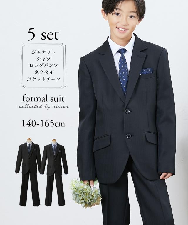 フォーマル スーツ 子供服 キッズ 卒業 5点セット 二つボタン ジャケット + シャツ パンツ ネクタイ +ポケット チーフ 男の子 身長165cm ニッセン nissen