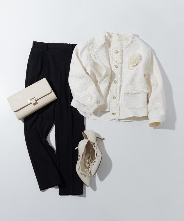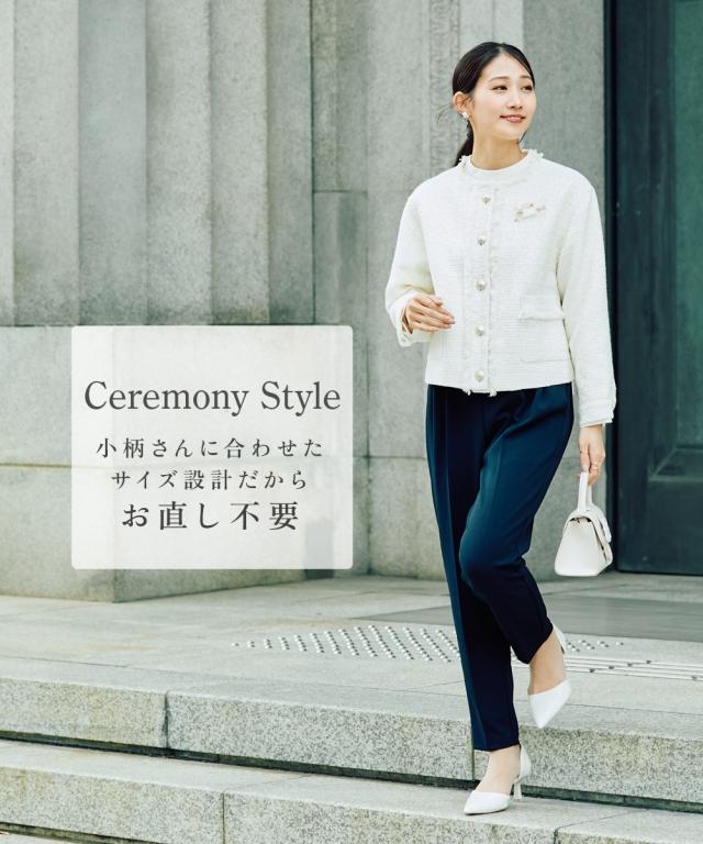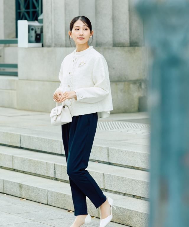 小さいサイズ 【入学式・卒業式・フォーマル】フォーマル3点セット(ドロップショルダーツイードジャケット+長袖ブラウス+テーパードパンツ)低身長さん・小柄女性