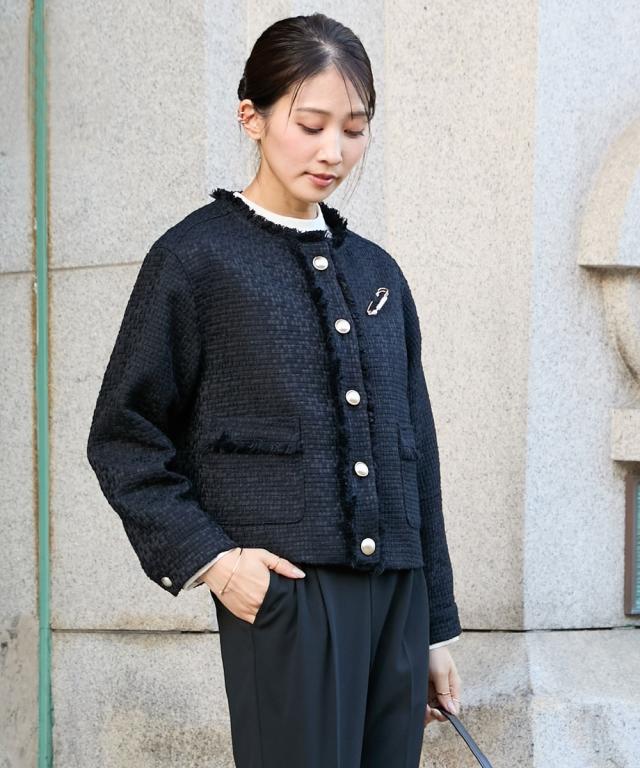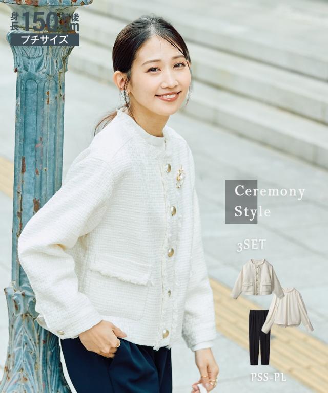 【150cm前後の小柄・低身長女性向けブランド−プッチージョ−】抜け感のあるドロップショルダーツイードジャケットが特徴のセットアップ。それぞれのアイテムは、もちろん単品でもお使いいただけるので、お手持ちのアイテムとの組み合わせもおすすめ。・ドロップショルダーツイードジャケットツイード編みで仕立てた高級感のある生地でお作りしたノーカラージャケット。一気に華やかなコーデに格上げされる、オケージョンといえば、の王道アイテム。セットインではなく、ドロップショルダーにすることで抜け感が出ます。きれいめアイテムに羽織って、セレモニースタイルに。別売りのコサージュを付けると、さらに華やかになります。ドロップショルダーなので、ゆったり見えしますが、着丈・袖丈が小柄さんにピッタリなので、着られている感も出ません。デニムと合わせてカジュアルダウンしたコーデもおすすめ。・長袖ブラウス上品な微光沢のあるブラウス。プチハイネックでロイヤルな雰囲気に。・テーパードパンツ細身のテーパードパンツ。ストレッチが効いていて、着心地もいいです。ドロップショルダーのジャケットととても相性がいいです。
