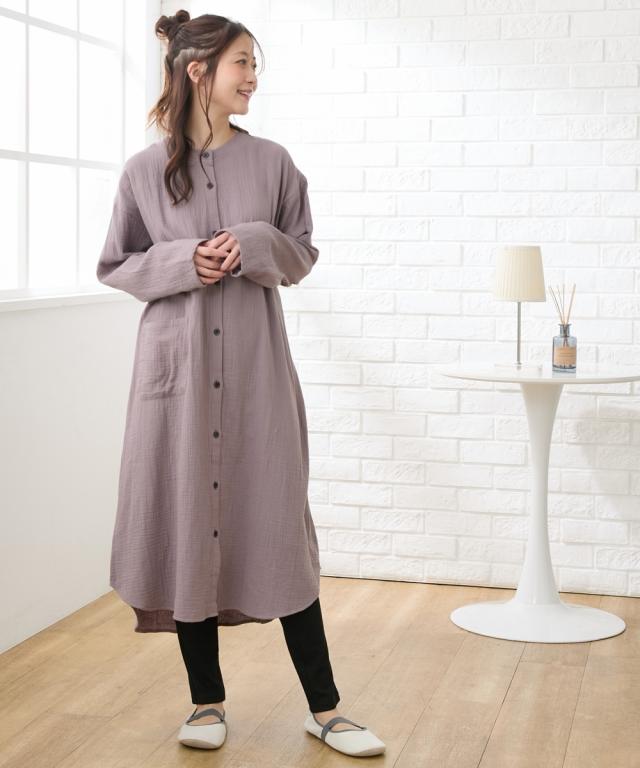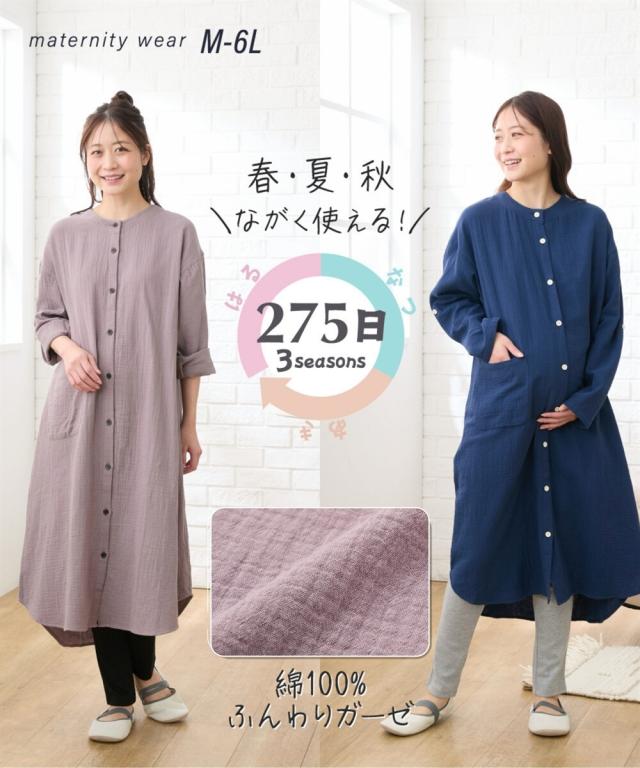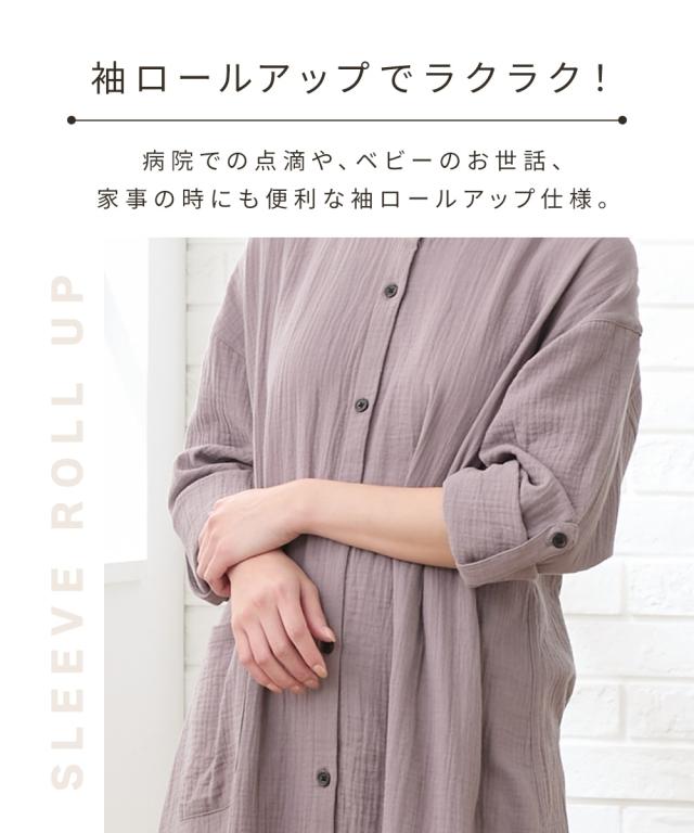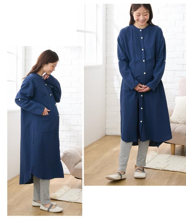 袖ロールアップで春・夏・秋の275日使える。 綿100%のダブルガーゼ素材で肌触りのいいマタニティパジャマです。 ■design ・ふんわりとやわらかいダブルガーゼのワンピースと、カットソーパンツの上下セット。 トップスの丈が長いので、お腹が苦しい時などはワンピース1枚でも着用できます。 ・着替えやすくて入院時の診察にも便利な前開きタイプ ・衿はすっきりとしてキチンと感もあるバンドカラー ■point ・胸の部分がスナップボタンになっていて、片手で簡単に外して授乳ができます。 それ以外のボタンは通常のボタンになっていてはだけにくく、特別な授乳口がないので授乳期が終わっても使いやすい ・パンツのウエストはボタン付きのゴムで調節ができ、産前〜産後のサイズ変化に対応。 アジャスターは外側に付いているので調節しやすく、就寝時もごろつきにくいです。 ・袖はボタンを留めてロールアップができるので、春〜秋の275日、長く使えます。 家事や育児で袖を上げたい時にも袖が留めておけるので便利です ・ポケットがついているので、スマホなどちょっとした小物を入れられます。 ■fabric ・ふんわりやわらかく、赤ちゃんの肌にもやさしいコ