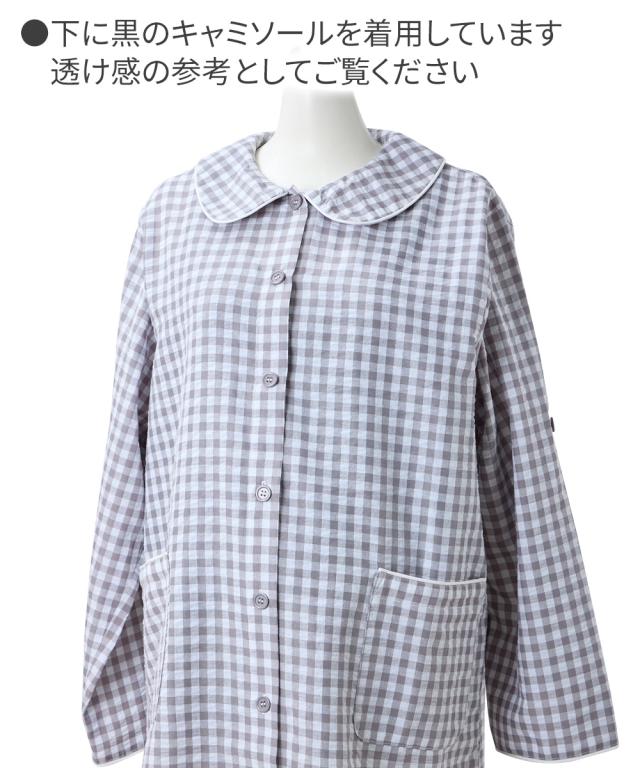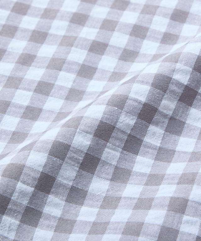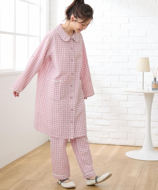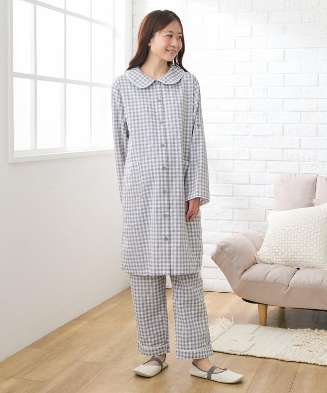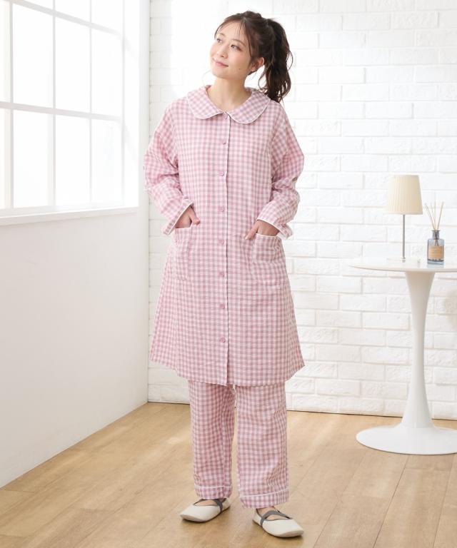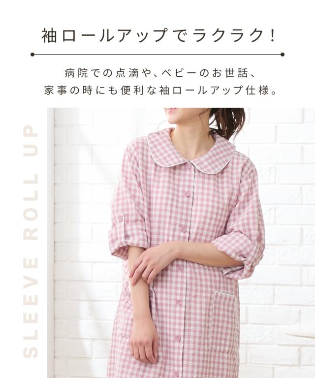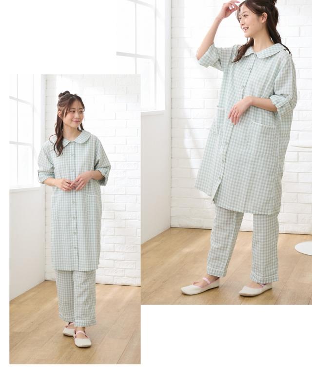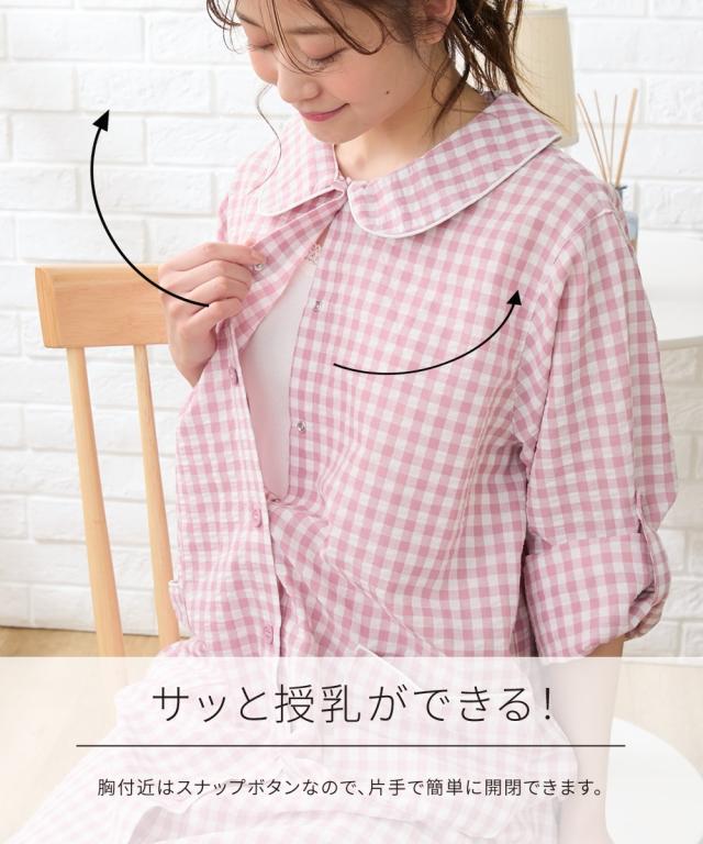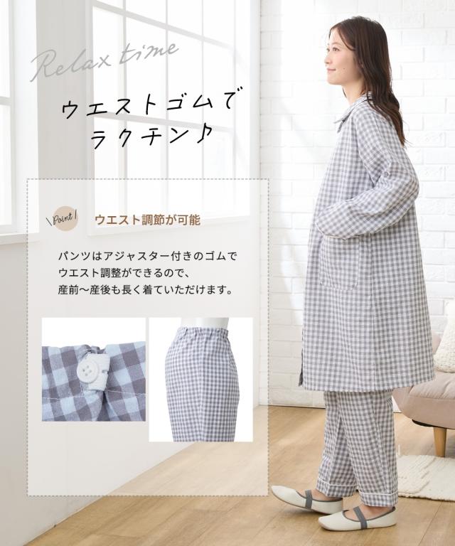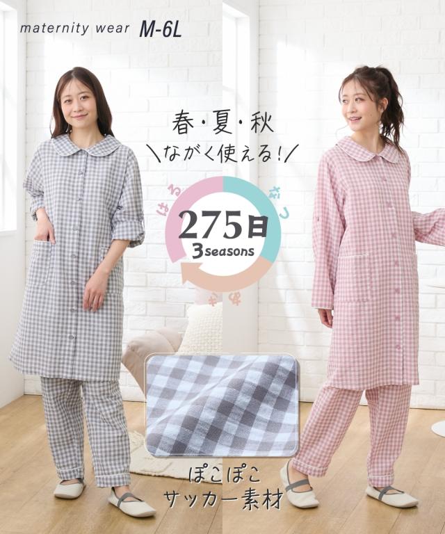 袖ロールアップで春・夏・秋の275日使える。 ぽこぽこサッカー素材でさらっとした着心地のマタニティ前開きパジャマです。 ■design ・お腹や腰回りをカバーできる長め丈のトップスと、パンツの上下セット ・寝ながらの診察や入院時に重宝する前開きタイプ ・淡い色合いのギンガムチェック柄&大きめの丸衿がかわいいデザイン ■point ・胸の部分だけがスナップボタンになっていて、片手で簡単に外して授乳ができます。 それ以外のボタンは通常のボタンになっていてはだけにくく、特別な授乳口がないので授乳期が終わっても使いやすい ・パンツのウエストはボタン付きのゴムで調節ができ、産前〜産後のサイズ変化に対応。 アジャスターは外側に付いているので調節しやすく、就寝時もごろつきにくいです。 ・袖はボタンを留めてロールアップができるので、春〜秋の275日、長く使えます。 家事や育児で袖を上げたい時にも袖が留めておけるので便利です ・ポケットがついているので、スマホやガーゼなどちょっとしたものを入れられます。 ■fabric ・凹凸感のある織物生地の綿混サッカー素材を使用。 肌に触れる面積が少ないので汗をかいてもべたつきにくく、暑い日