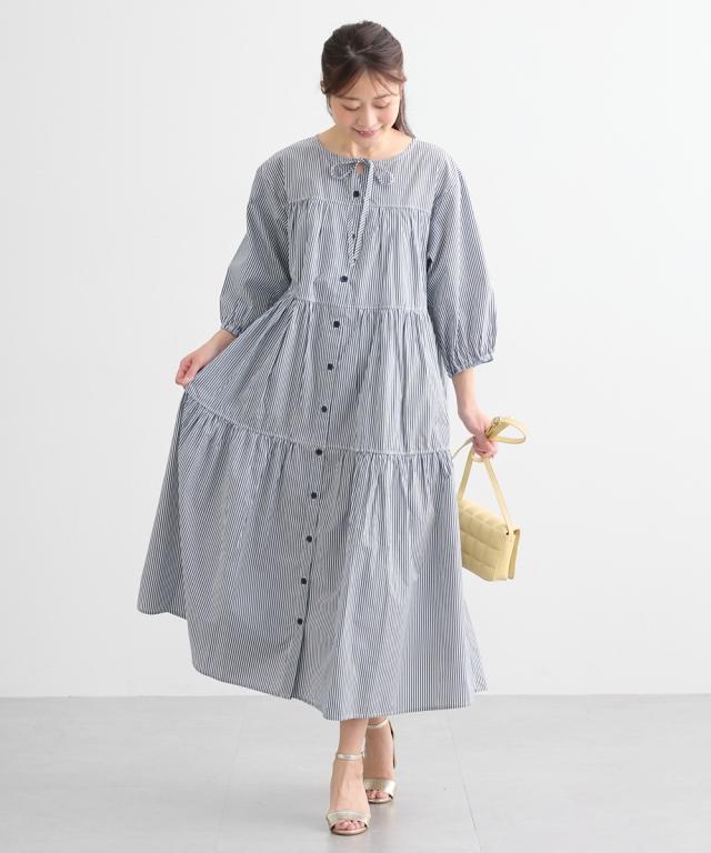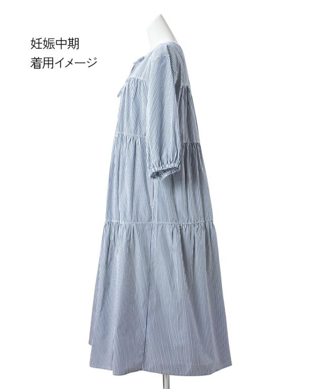 ふんわりとしたティアードがかわいい、七分袖のマタニティワンピースです。 ■design ・体型をカバーできる、ふわっと広がるシルエット ・歩くたびに裾が揺れてきれいなティアードデザイン ・胸元のリボンがかわいいアクセント ■point ・授乳は前ボタンをあけて授乳ができます。 特別な授乳口がないので、マタニティ期や卒乳後も普通のワンピースとして長く着られます ・両脇にポケットがあるので、ガーゼやハンカチなど、ちょっとした小物が入れられて便利です。 ■fabric ・綿混の織物生地で、さらっと爽やかで軽い着心地 ・春夏秋向き ■maternity ・産前から産後に使う ・授乳機能付(前ボタン開き)