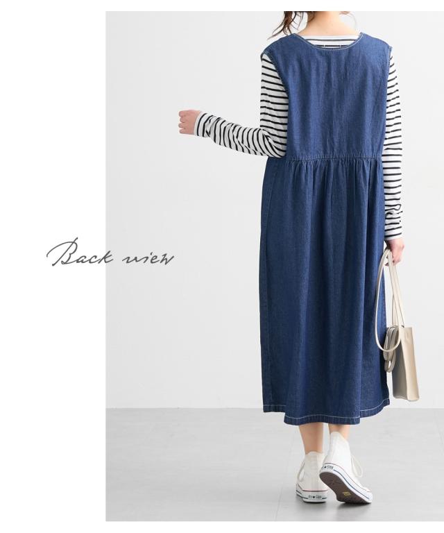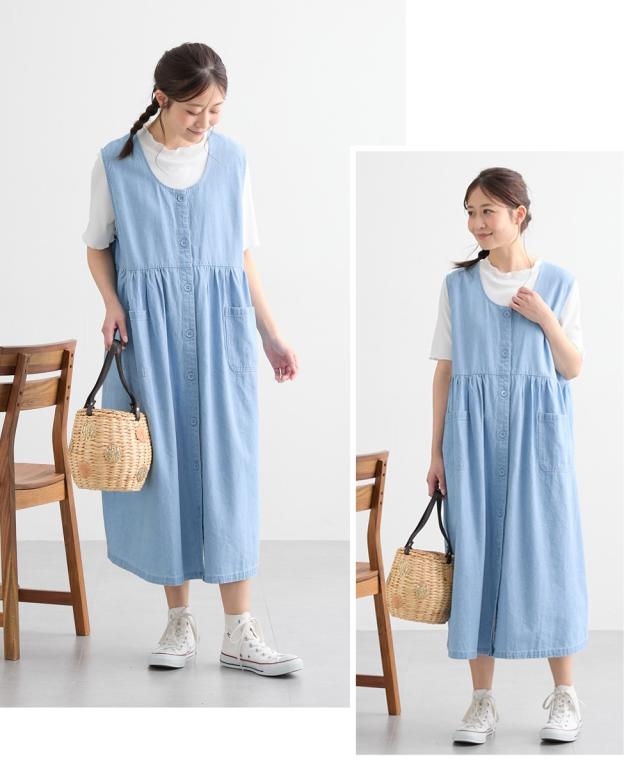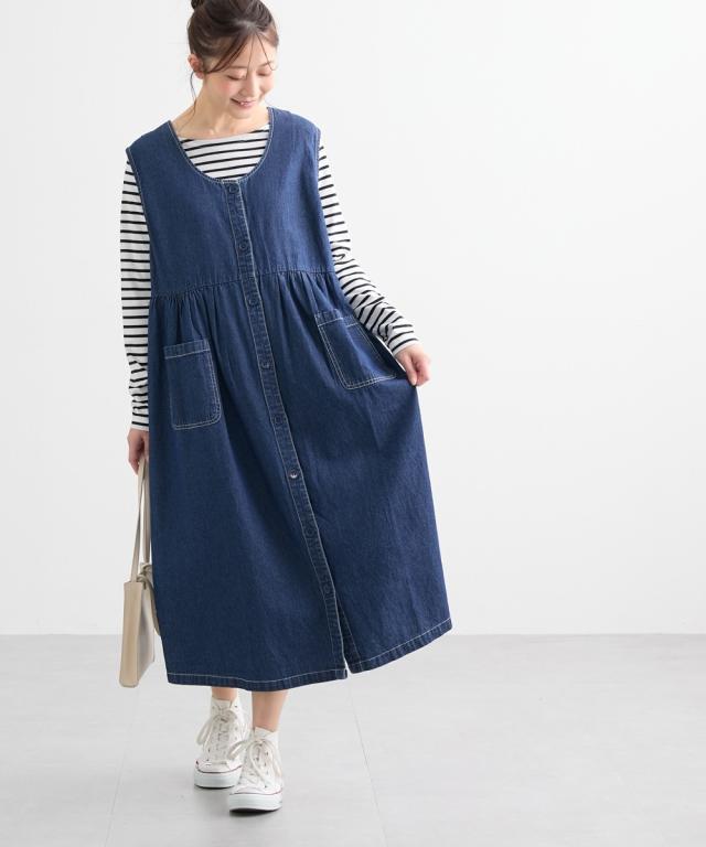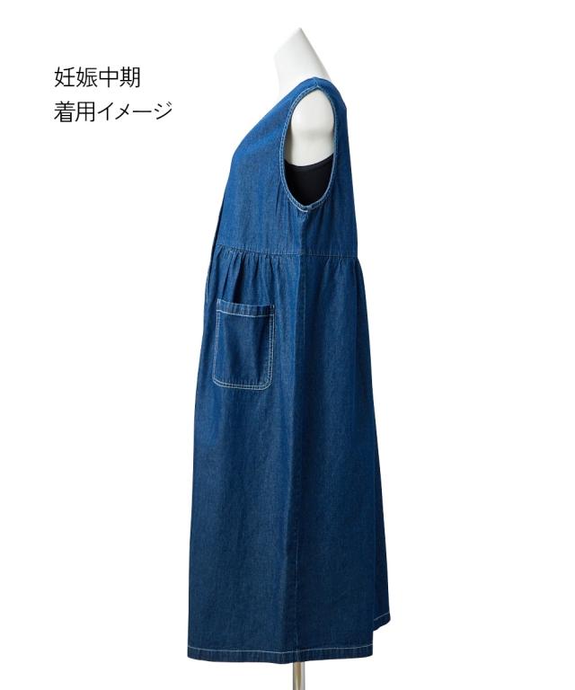 マタニティ ワンピース 授乳服 ママ ウェア 綿100% デニム ウエスト ギャザー 前開き ジャンパー スカート 産前 産後 産前 産後 3L/4L ニッセン nissen