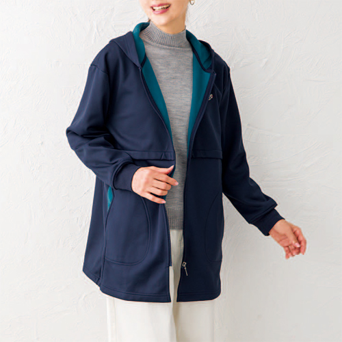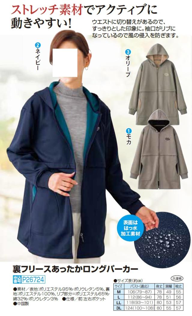 裏フリースあったかロングパーカー 全3色 パーカー ロング丈 はっ水加工 レディース 婦人服 ミセス シニア 女性 モカブラウン オリーブグリーン ネイビー 体型カバー 無地 リブ袖 シンプル ファッション 40代 50代 60代 70代 80代 母の日 お母さん 秋冬 fuji p26724