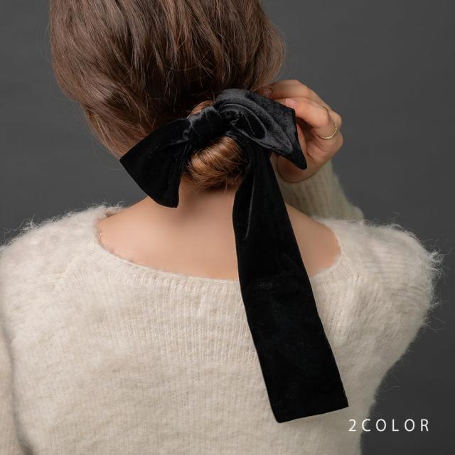 【ゆうパケット送料無料】 ポニーフック ベロア リボン ベルベット ロング 光沢感 アシンメトリー 調整可能 ボリューム 大きめ 存在感 ヘアゴム ヘアアクセサリー 髪留め まとめ髪 大人 ブラック カーキ
