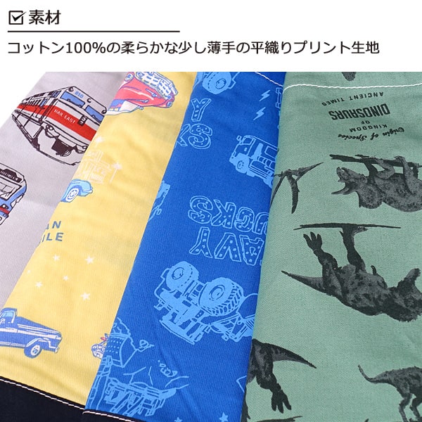 | カラー | 11ネイビー(無地×ヒッコリー) 18カーキ(ドット柄×無地) 37マスタード(ヒョウ柄×無地) 5グリーン(恐竜柄×無地) 9イエロー(車柄×無地) 16ブルー(働く車柄×無地) 3グレー(電車柄×無地) |
