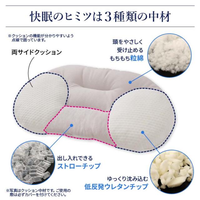 ●1.快眠のヒミツは3種類の中材:低反発ウレタンチップ、粒綿、ストローチップ