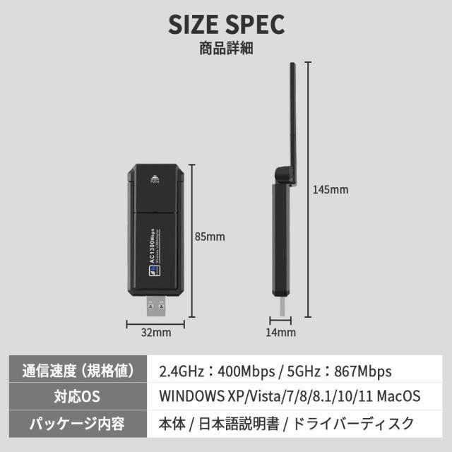 商品詳細: Windows10/11では挿すだけで自動的にインストール可能です。その他のWindowsでは一度再起動する必要があります。 こちらのWiFi 無線LAN子機は、2.4GHzおよび5GHzの周波数帯域をサポートします。干渉が少ないので速度が速くなります。 5GHz周波数帯域で1201Mbps、2.4GHz周波数帯域では574MbpsのWiFiレートを実現可能です。