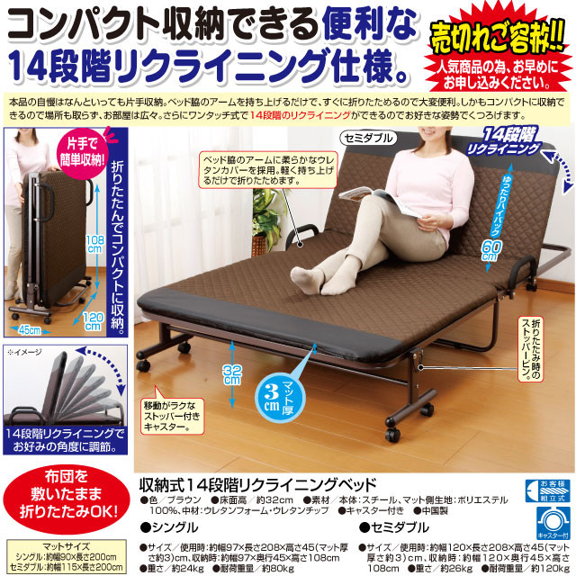 商品詳細: ●本品の自慢はなんといっても片手収納。ベッド脇のアームを持ち上げるだけで、すぐに折りたためるので大変便利。しかもコンパクトに収納できるので場所も取らず、お部屋は広々。さらにワンタッチ式で14段階のリクライニングができるのでお好きな姿勢でくつろげます。