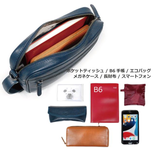 本体はB6サイズのものが収納でき、大きすぎない使いやすいサイズです。 手帳やスマホ、長財布など必要なものが入るので、外出や散策におすすめです。