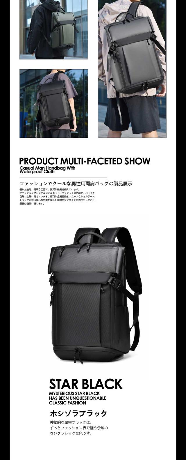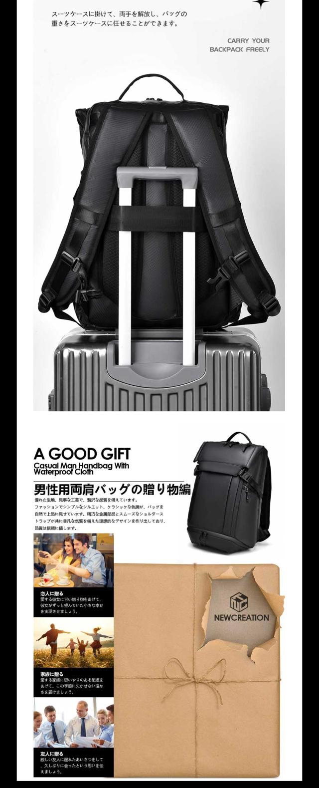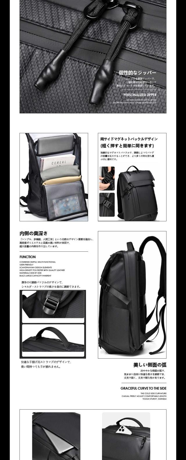 【優れた耐久性と防水性】 優れた耐久性のある防撥水素材になっているため、水を弾きます。※ファスナー部は防水仕様でない為、完全防水ではありません。 【快適な背負い心地】背面は背骨のS字に合わせたデザインを採用しており、肩や背中への負担を軽減することができます。リュックの背面とショルダー部分には、通気性の良いメッシュ素材を使用しています。長時間背負っても蒸れにくく、疲れにくいため、快適に歩くことができます。 【出張時に便利なキャリーオンも可能】 スーツケースの上に乗せることができるキャリーオンなら、資料などの重い荷物を入れてるときでも肩が凝 ることもありません。もちろん機内持ち込み可能なサイズで設計しているので、飛行機でご使用も可能です 注意書き |