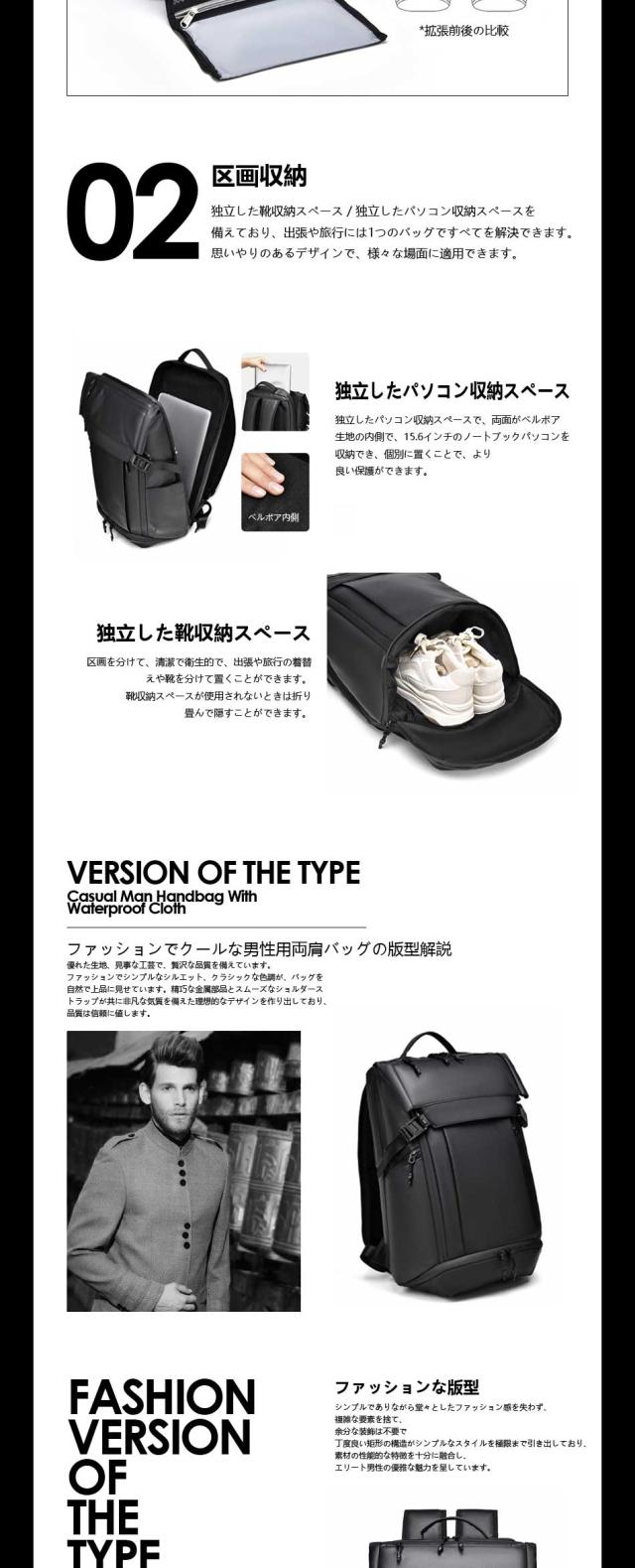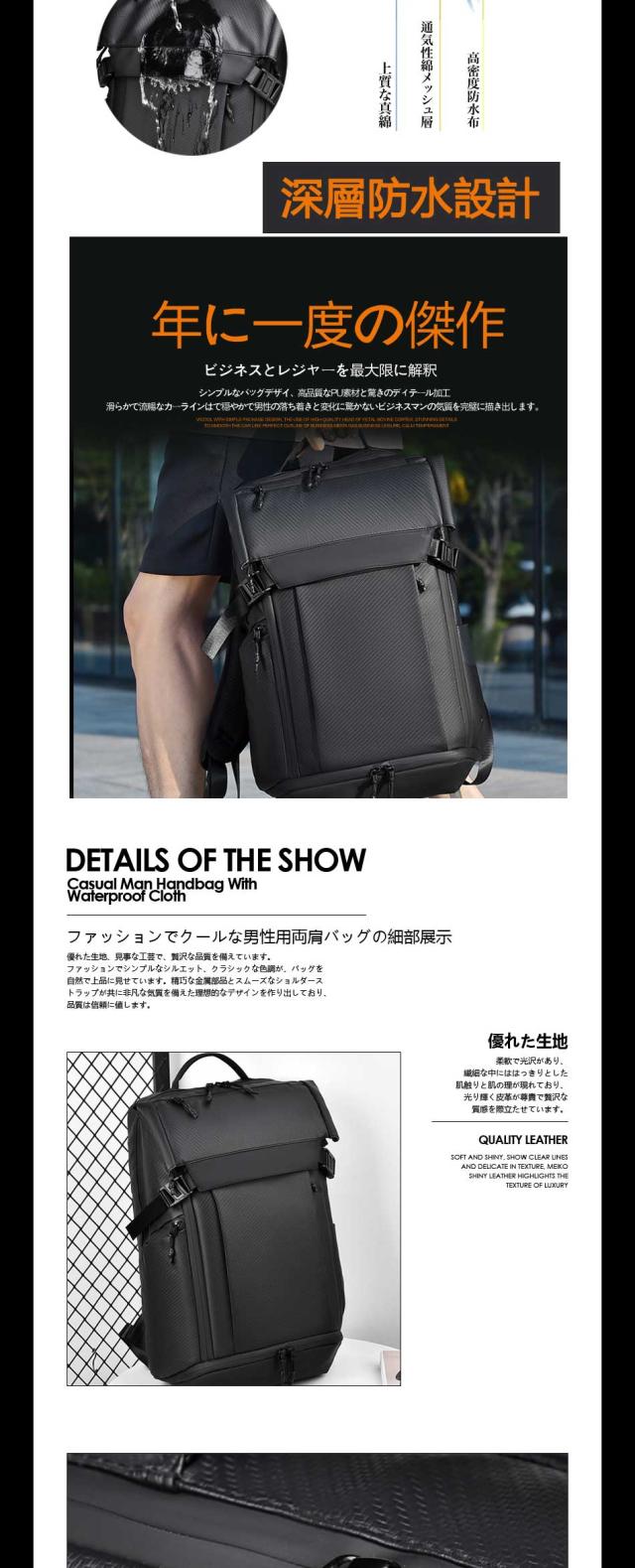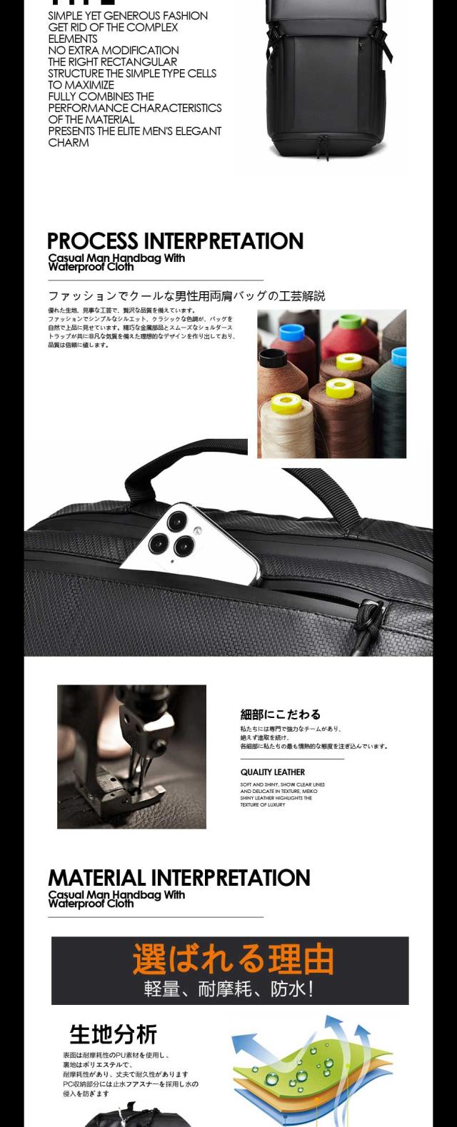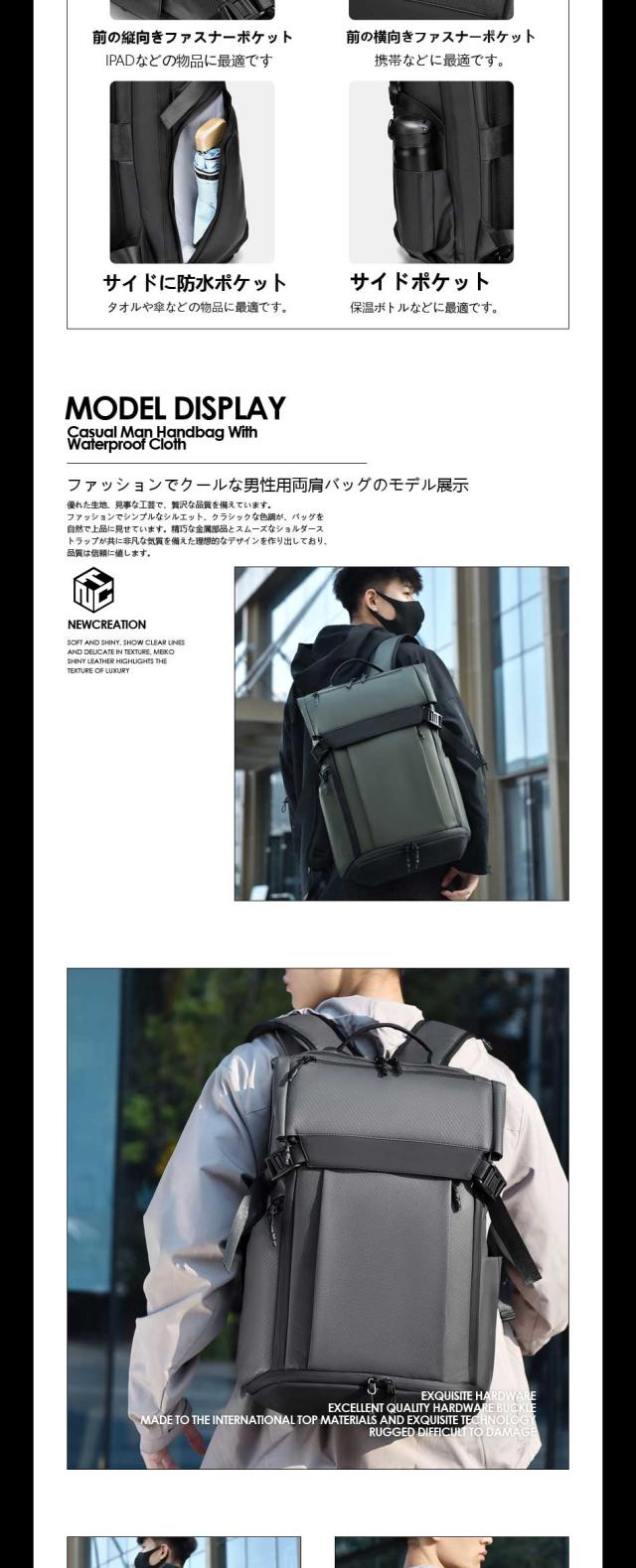 【優れた耐久性と防水性】 優れた耐久性のある防撥水素材になっているため、水を弾きます。※ファスナー部は防水仕様でない為、完全防水ではありません。 【快適な背負い心地】背面は背骨のS字に合わせたデザインを採用しており、肩や背中への負担を軽減することができます。リュックの背面とショルダー部分には、通気性の良いメッシュ素材を使用しています。長時間背負っても蒸れにくく、疲れにくいため、快適に歩くことができます。 【出張時に便利なキャリーオンも可能】 スーツケースの上に乗せることができるキャリーオンなら、資料などの重い荷物を入れてるときでも肩が凝 ることもありません。もちろん機内持ち込み可能なサイズで設計しているので、飛行機でご使用も可能です 注意書き |