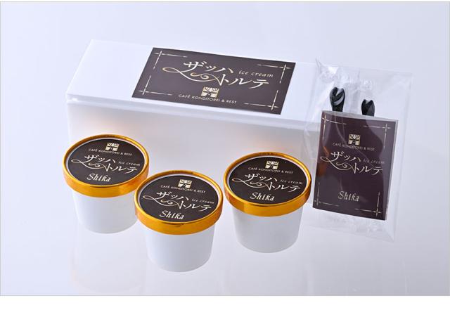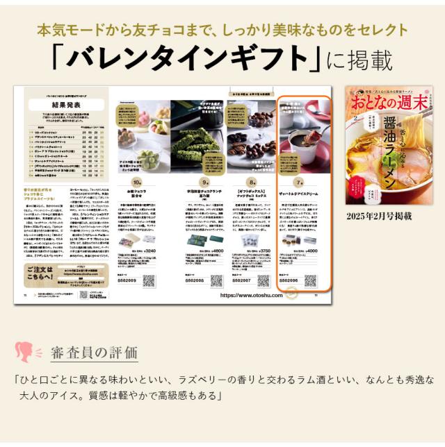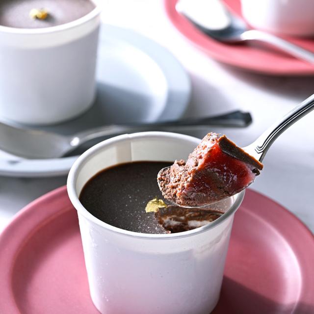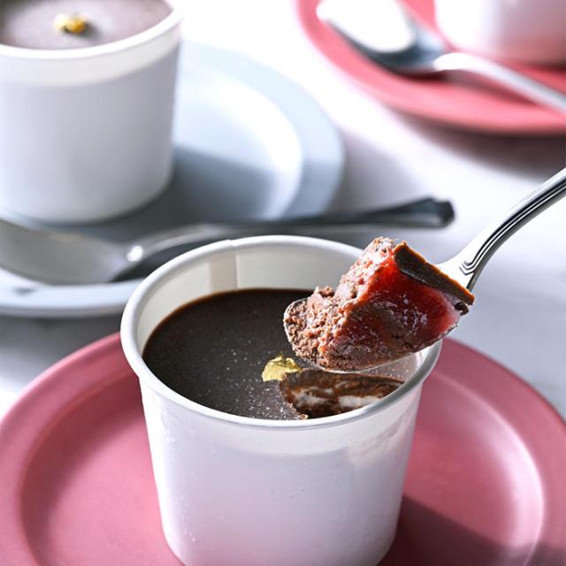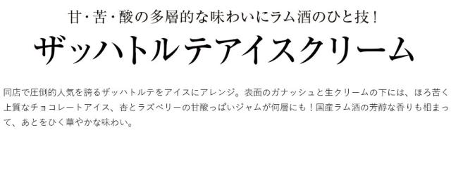同店で圧倒的人気を誇るザッハトルテをアイスにアレンジ。表面のガナッシュと生クリームの下には、ほろ苦く上質なチョコレートアイス、杏とラズベリーの甘酸っぱいジャムが何層にも! 国産ラム酒の芳醇な香りも相まって、あとをひく華やかな味わい。