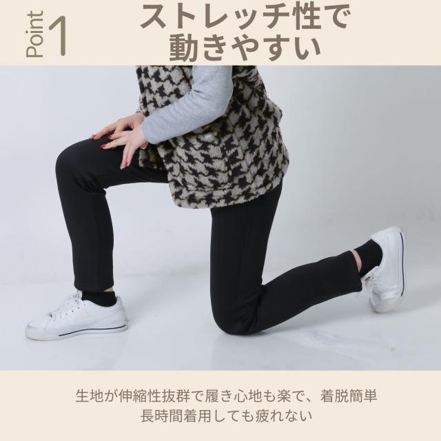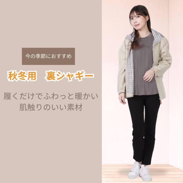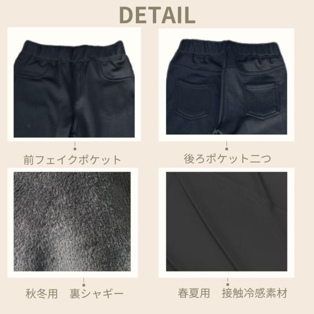 【カラー】 ブラック【素材】 接触冷感生地(春夏用)レーヨン65%ナイロン30%ポリウレタン5%裏シャギー(秋冬用) ポリエステル97%ポリウレタン3%【裾の長さ(丈)】 10分丈【柄】 無地【テイスト(ファッション)】 カジュアル伸縮性抜群でストレッチ性があります。動きやすく、そして脱いだり履いたりしやすいです。春夏用は接触冷感生地でさらっとして履いた瞬間ひんやりとして履き心地抜群です。秋冬用はふんわり柔らかボリュームの裏シャギー付きで触り心地も着心地もよく、毛布を着ているような温かさです。この冬にぴったりのボトムスです。家庭洗濯対応しています。(手洗い表示)注意事項 ■染料の性質上、汗や摩擦により色落ちしたり他に色移りすることがありますのでご注意下さい。■万一色が落ちた場合には、移ったものを早めに洗濯してください■洗濯により、若干の色落ちがありますので他の物とわけて洗って下さい。(単独洗い)■商品の撮影には最大限注意を払っておりますが、閲覧時のモニター環境によりましては実際の商品と若干違うお色味に映ることもございます。
