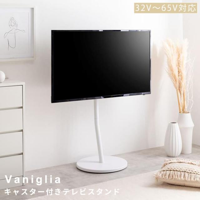 白いボディと丸い足元が魅力のキャスター付きテレビスタンドVaniglia (ヴァニリア)。