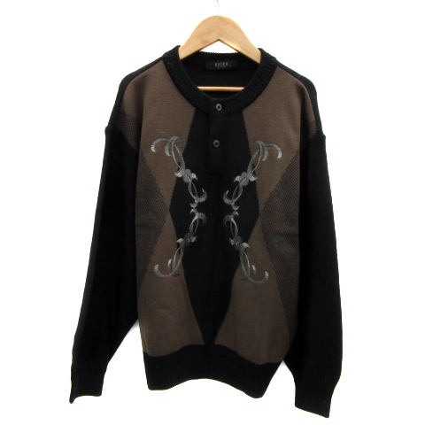 【中古】ライカ ニット セーター ヘンリーネック アーガイルチェック柄 刺繍 M マルチカラー 黒 レディース