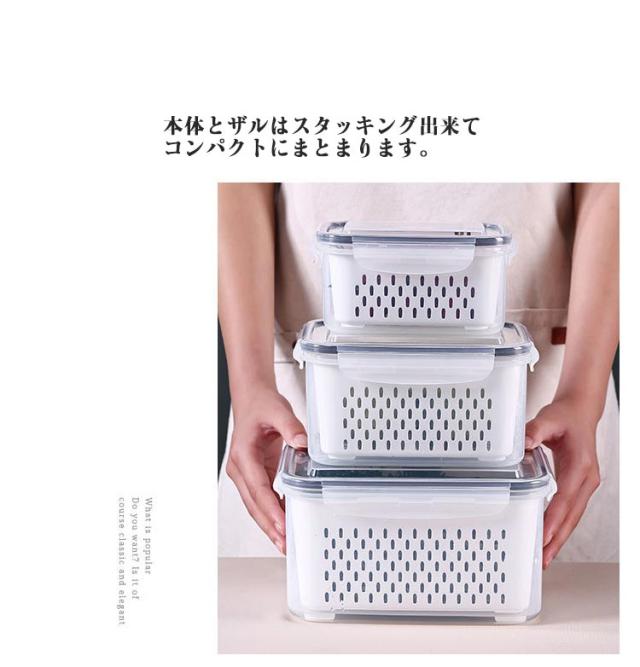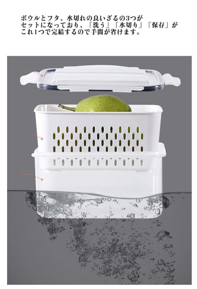 | 3個セット!洗って水切り、そのまま冷蔵庫で保存できるザル付き保存容器。 ボウルとフタ、水切れの良いざるの3つがセットになっており、「洗う」「水切り」「保存」がこれ1つで完結するので手間が省けます。 手軽に食べたい生野菜、レタスやプチトマトなどを洗って水を切りそのまま保存できる保存容器です。 フタは透明にこだわって、中身や鮮度が冷蔵庫に入ったままでも分かりやすいようにしました。 本体とザルはスタッキング出来てコンパクトにまとまります。 | |