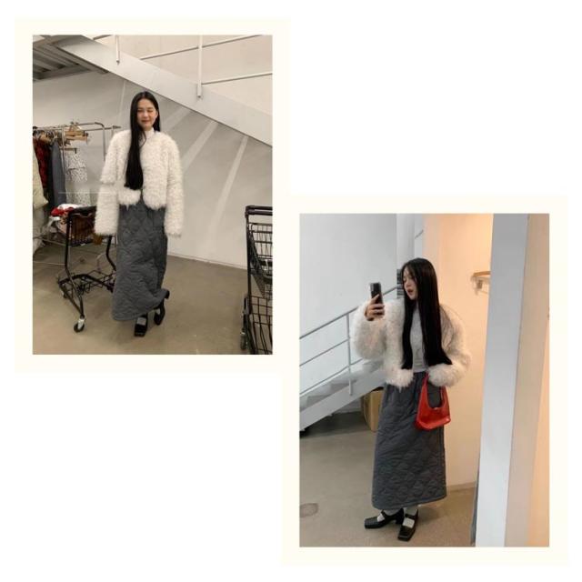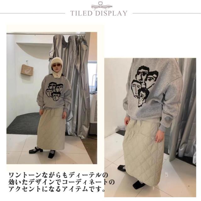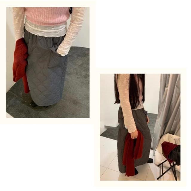 | シーズンムードたっぷりなキルティング素材のロングスカート。 程よい中綿のボリューム感は柔らかくて着やすいのも◎ 軽い着心地で暖かさもキープできるのも魅力的。 使い勝手の良いポケットが1つ付いています。スマホがすっぽり収まるサイズで小物をちょこっと入れるのに便利! ワントーンながらもディーテルの効いたデザインでコーディネートのアクセントになるアイテムです。 | |