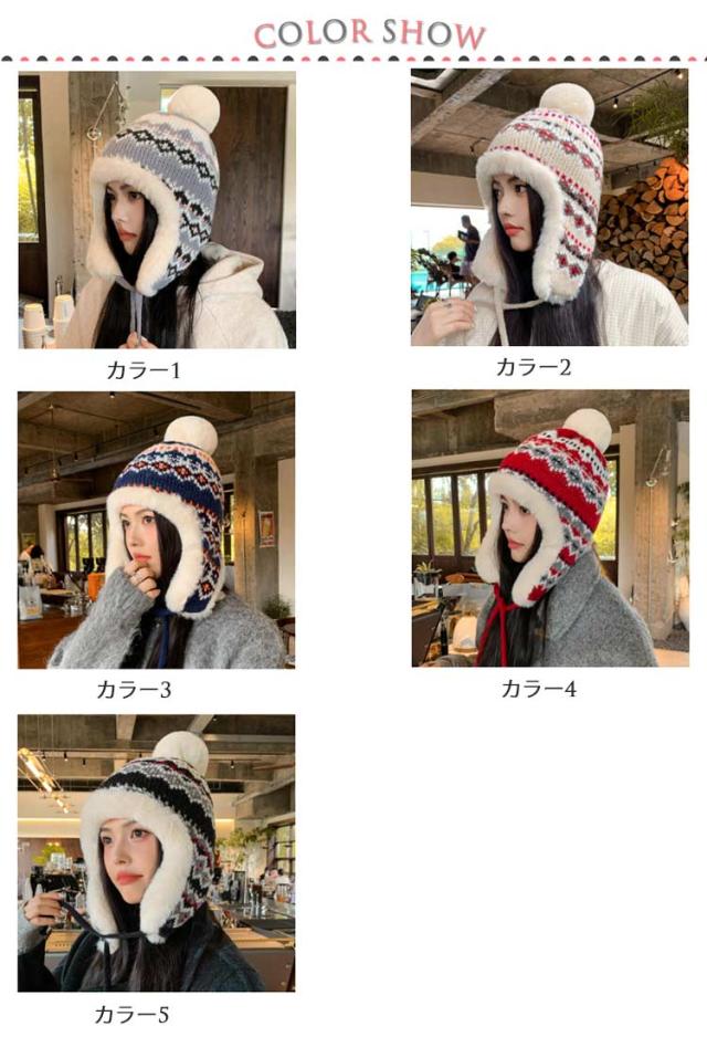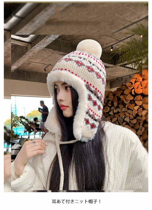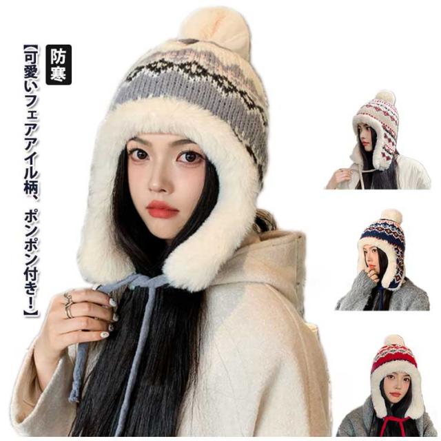 冬物 ニット帽子 レディース 大人可愛い ノルディック柄 ノルディック柄 秋冬 耳当て付き ポンポン ニットキャップ 裏ボア あったか もこもこ ニット帽 防寒 カジュアル ナチュラル スキー スノボー ウインタースポーツ
