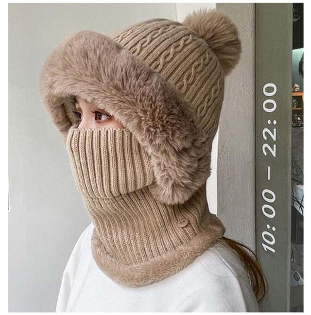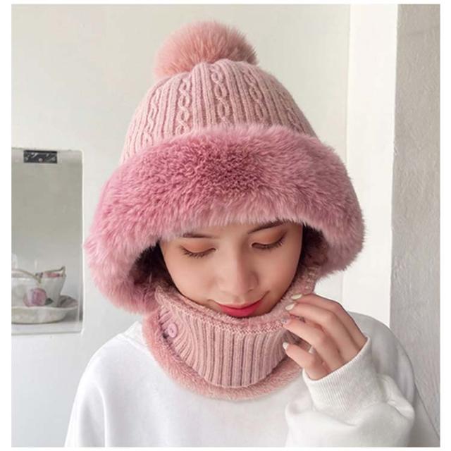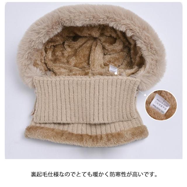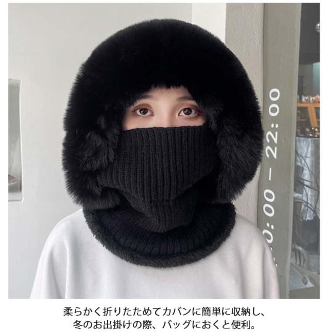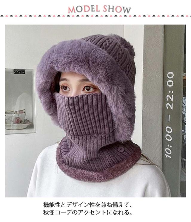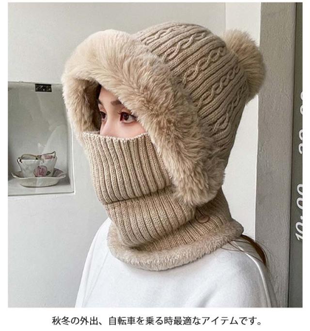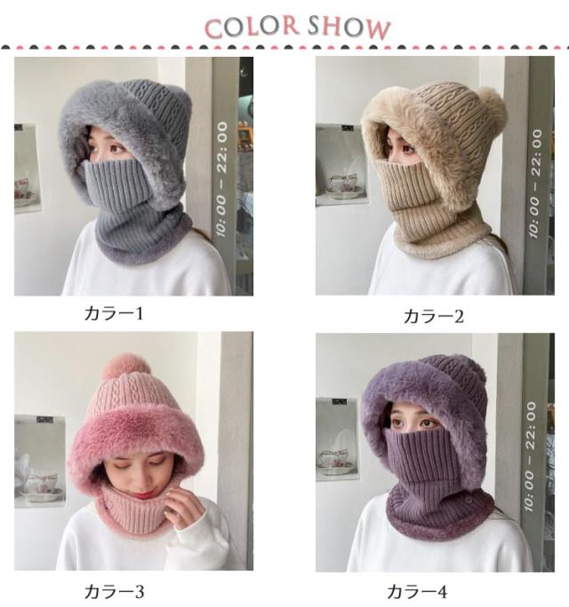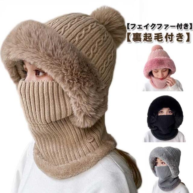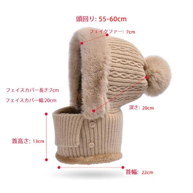フェイクファー 帽子 フェイクファー 一体 ネックウォーマー 防寒 フェイスカバー付き ケーブル編み ポンポン レディース ニットキャップ キャスケット ゴルフウェア レディース 冬 裏起毛 保温 目出し帽 ニット帽子 暖かい アウトドア