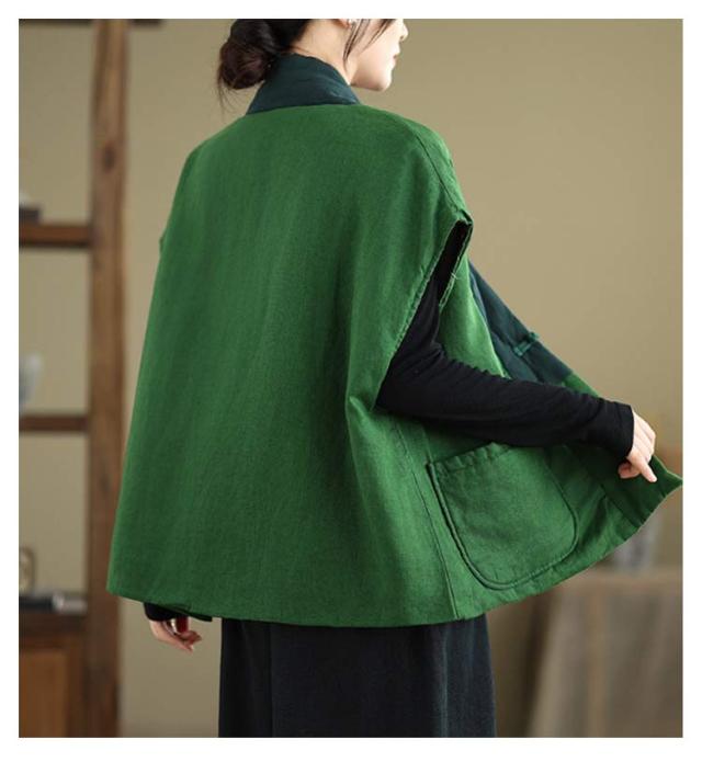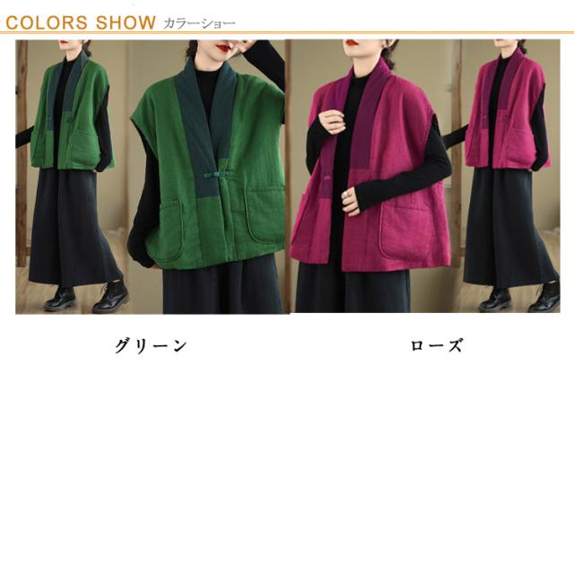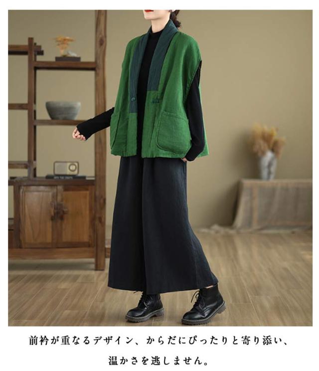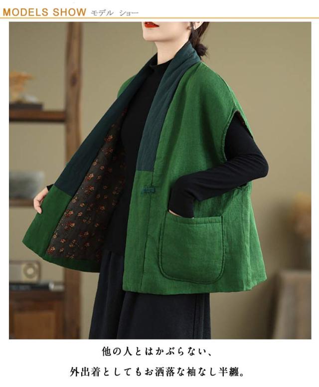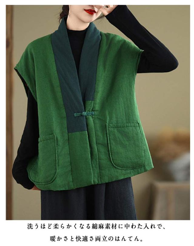中わた チャイナ風 冬 はんてん ルームウェア 防寒 おしゃれ 綿麻 半纏 暖かい 半天 袢纏 30代 部屋着 袖なし 綿入れ 綿入り 中綿ベスト お出かけ 外出 厚手 羽織り 中華風 はんてん ポケット付