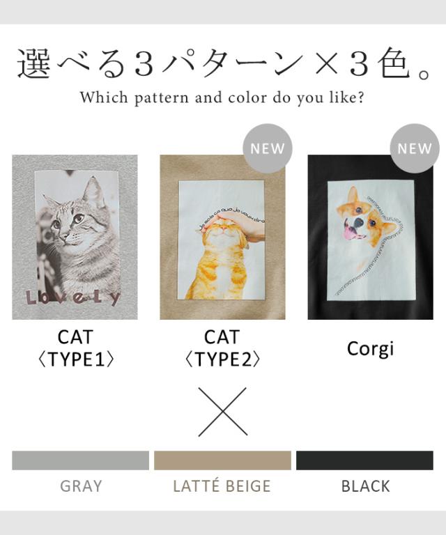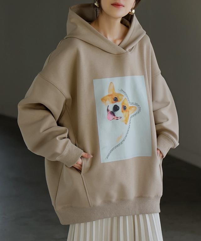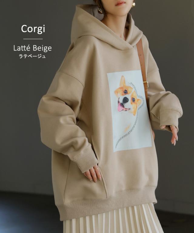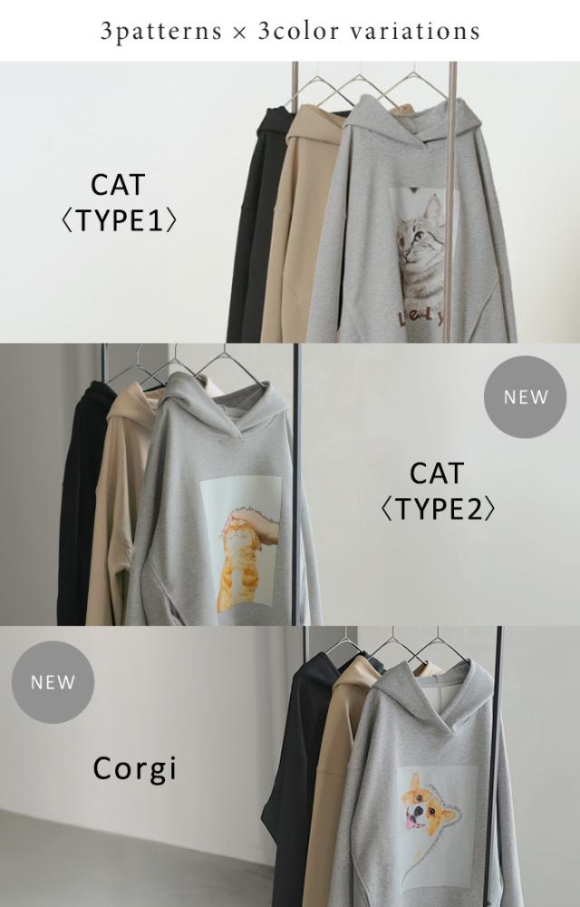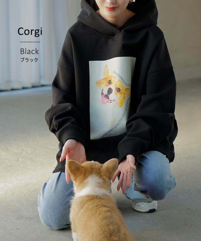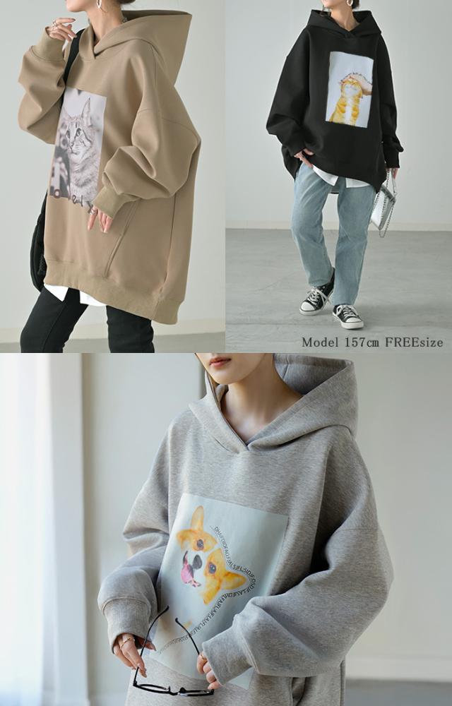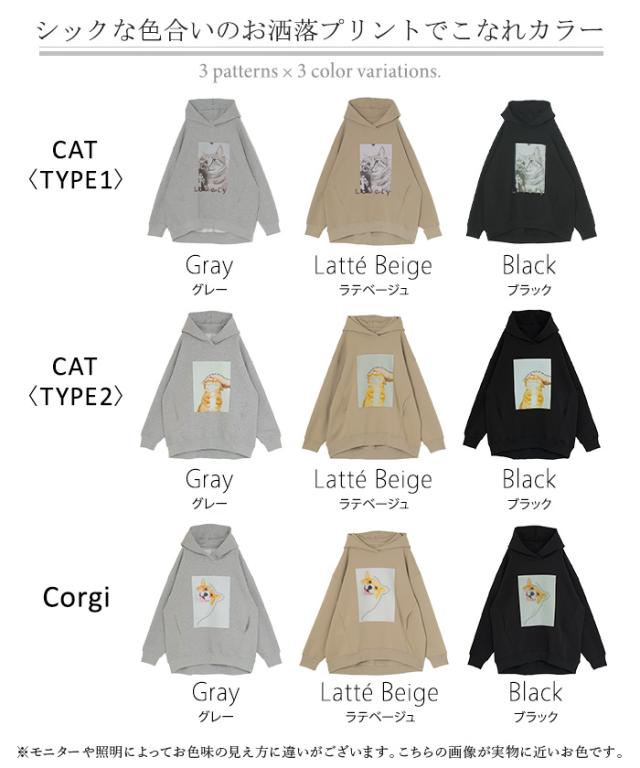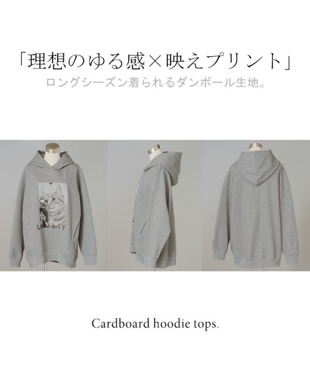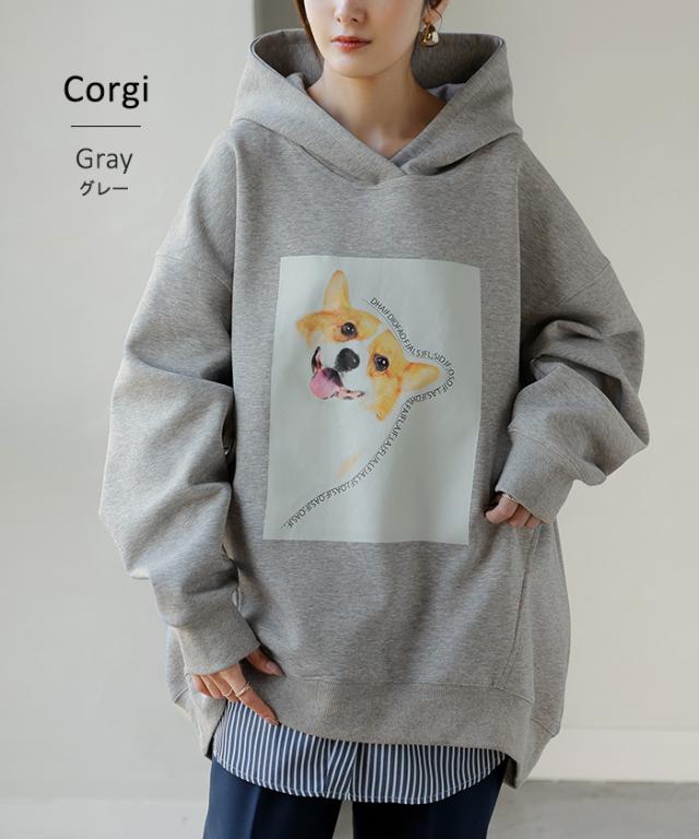 パーカー 猫 ダンボール レディース トップス トレーナー プリント シワになりにくい ロング ロングパーカー プルオーバー フード ビッグ お尻が隠れる 体型カバー 大きいサイズ 猫柄 猫グッズ コーギー ネコ 犬 イヌ グレー 黒 秋 冬 HUG.U