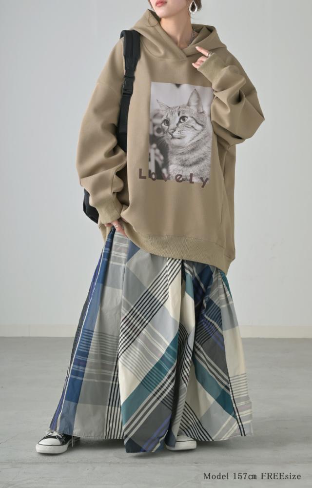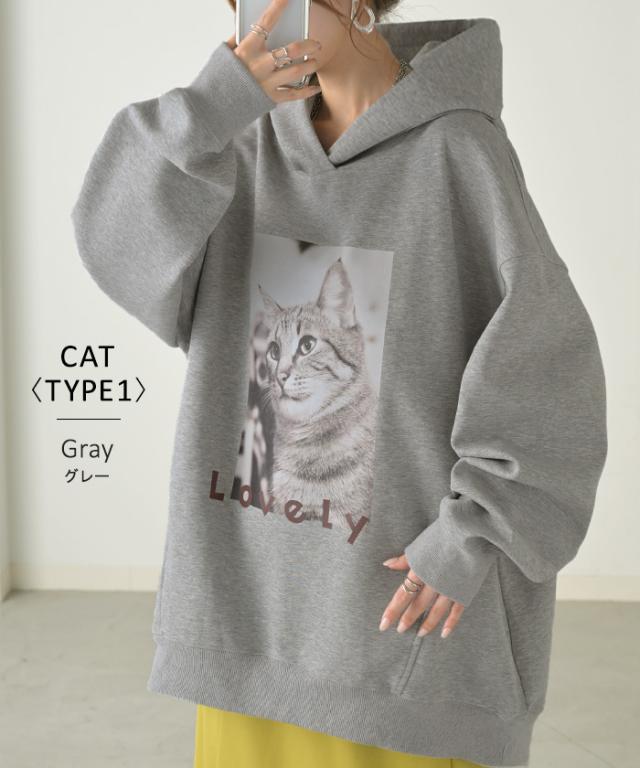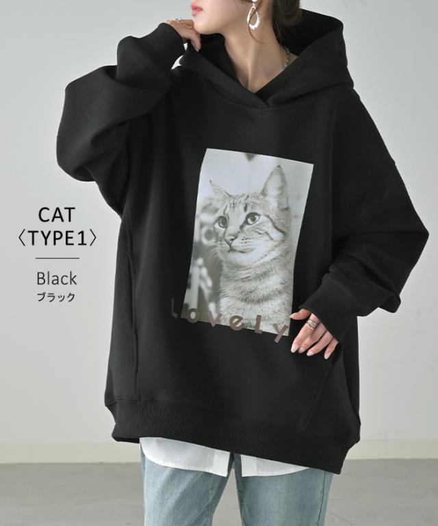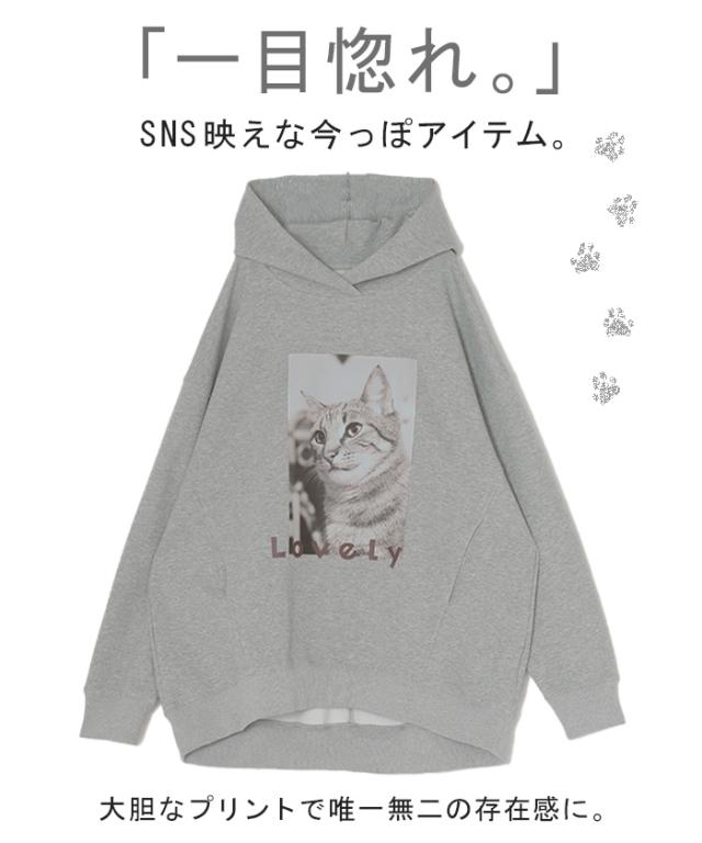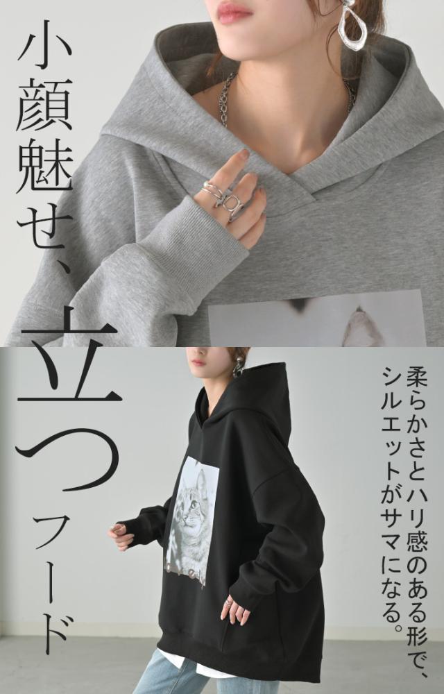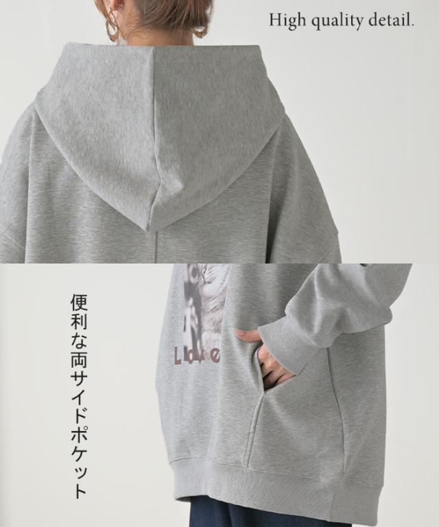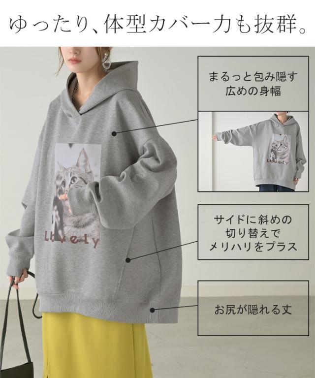 猫のプリントがアクセントの、ゆったりサイズ感のパーカーです。