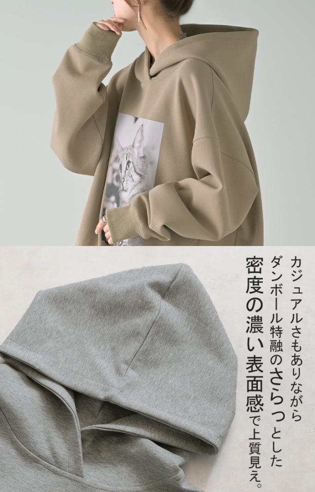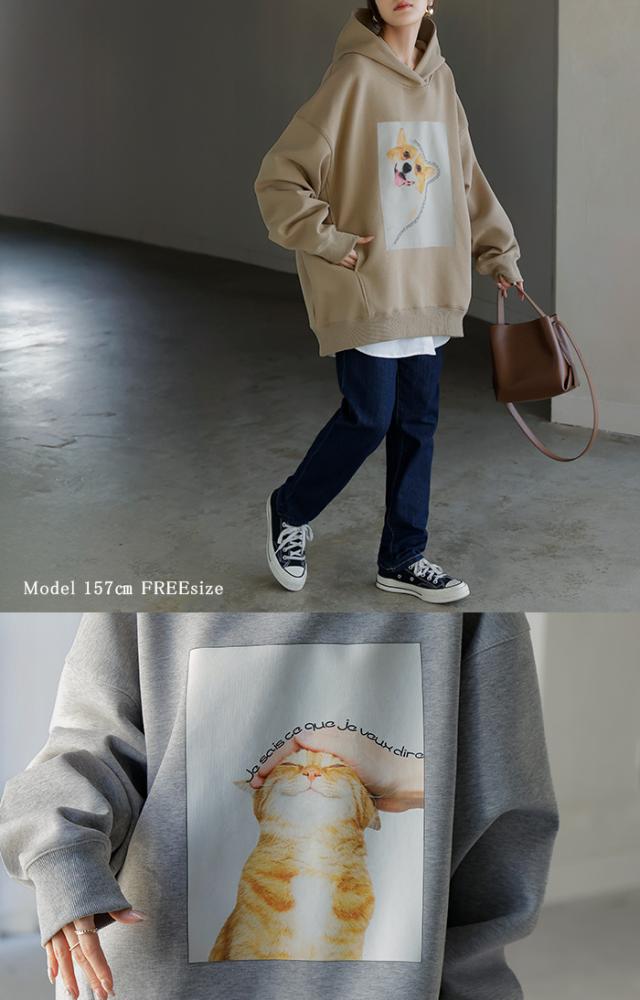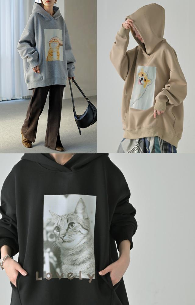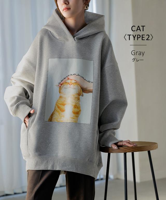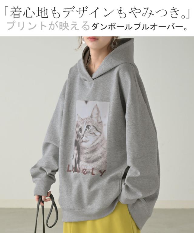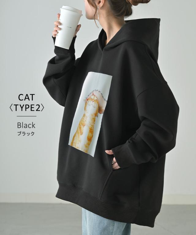 猫のプリントがアクセントの、ゆったりサイズ感のパーカーです。