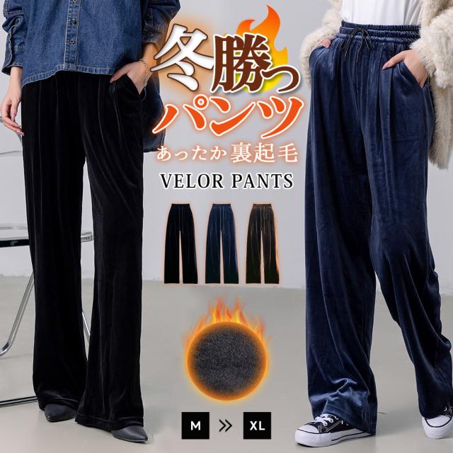冬新作 「優秀!暖か裏起毛」パンツ 裏起毛 ベロア ワイドパンツ レディース きれいめ 暖かい あったか ストレート ウエストゴム ゆったり ウエスト調節 紐 無地 ポケット ワンマイルウェア ルームウェア 部屋着 楽ちん ロングパンツ ダンス 秋 冬 黒
