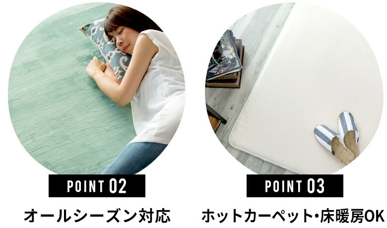 | 夏場はエアコンの冷えをカバーし、さらっとした手触りで心地よく過ごせます。冬場は寒い底冷えを保温性でカバー。年中大活躍するラグです。 | こちらのラグは、床暖房・ホットカーペット に対応できます。また、こたつの敷き布団としてもお使いいただけます。 |