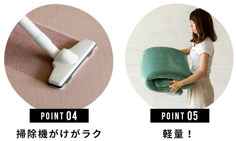 | 毛足が短いのでホコリが絡まず、掃除機がけもラクラク。ごみや髪の毛・ホコリも埋もれにくく、しっかり吸い取れます。 | 女性ひとりでも持ち運びできるので、お掃除のときなど、移動も楽ちん。不使用時は折りたたんで収納! |