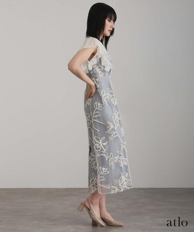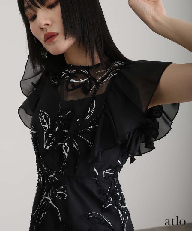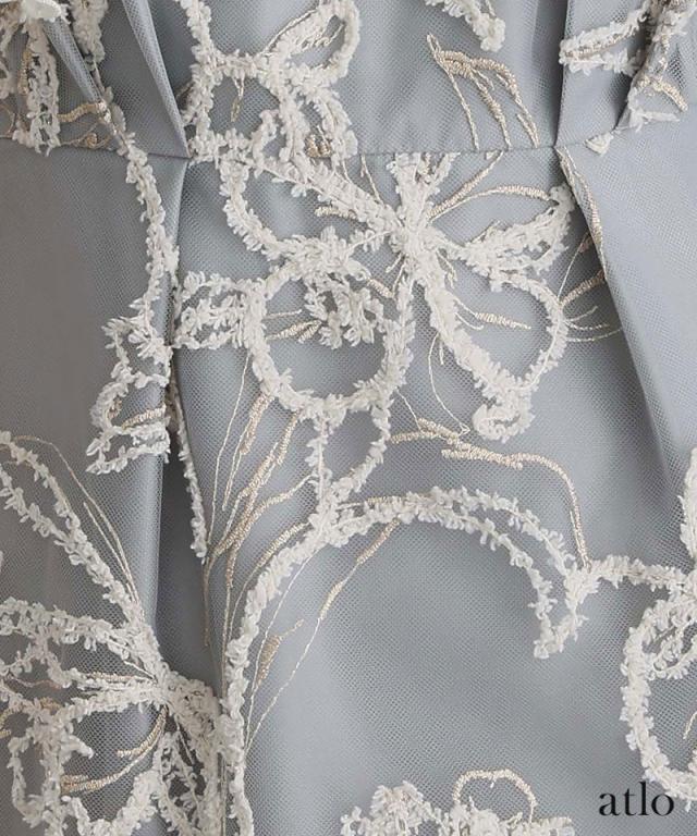 立体感のあるラメ糸を使用した刺繍が華やかな存在感を放つ一着。