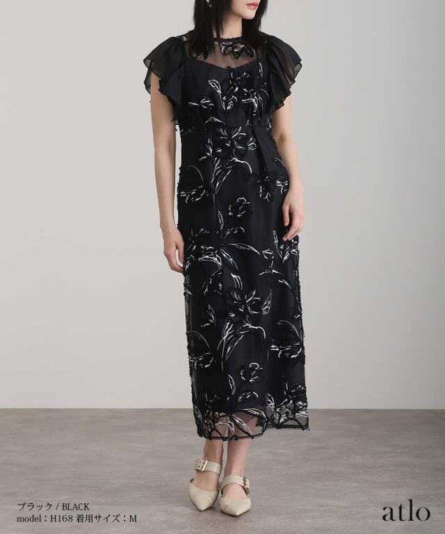 フェザーフラワーダブルフレアスリーブドレス【217241978】10代・20代・30代・40代・50代・ドレスワンピ・フォーマルワンピ・パンツドレス・服装・ワンピース・ドレスカジュアル・ブランド・七分袖・長袖・ロング・膝丈・薄手・厚手・無地・刺繍・脚長効果・伸縮性・キレイめ・着やせ・体型カバー・スタイルアップ・レース・リボン・ドレープ・小さいサイズ・3Lや4L・かっこいい・かわいい・即日発送・送料無料・結婚式・婚活・披露宴・顔合わせ・発表会・演奏会・二次会・同窓会・お呼ばれ・食事会・謝恩会・親族・七五三・お宮参り・冠婚葬祭・弔事・女子会・韓国・デート・入学式・卒業式・入園式・卒園式・ママ・ピアノ・マタニティー・セレモニー・セレブ・パーティー