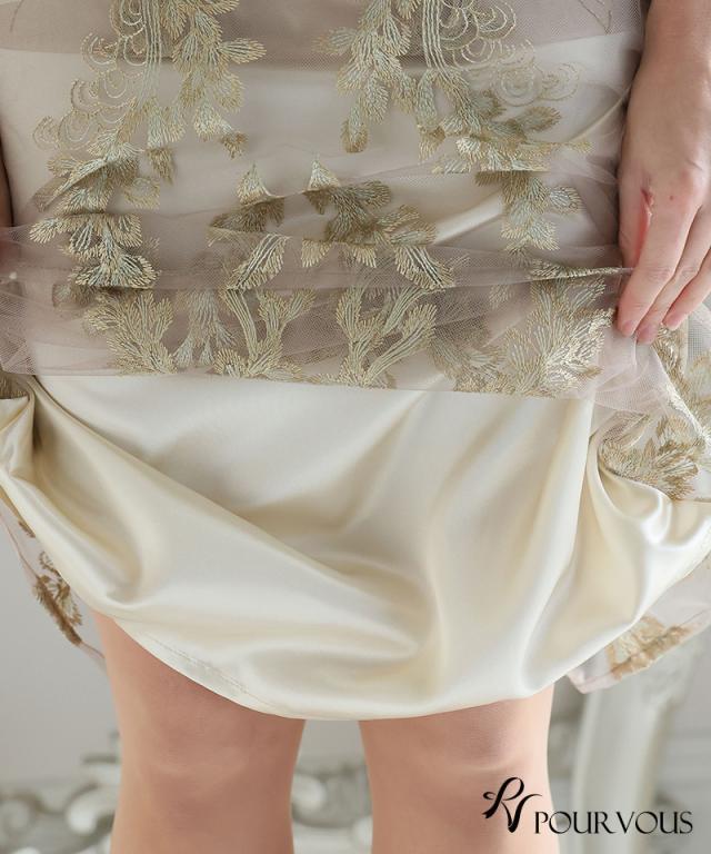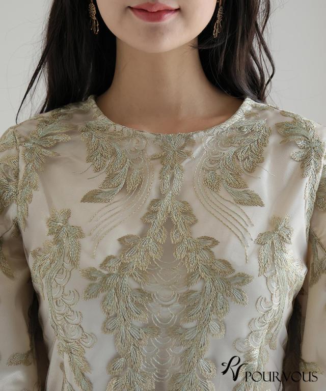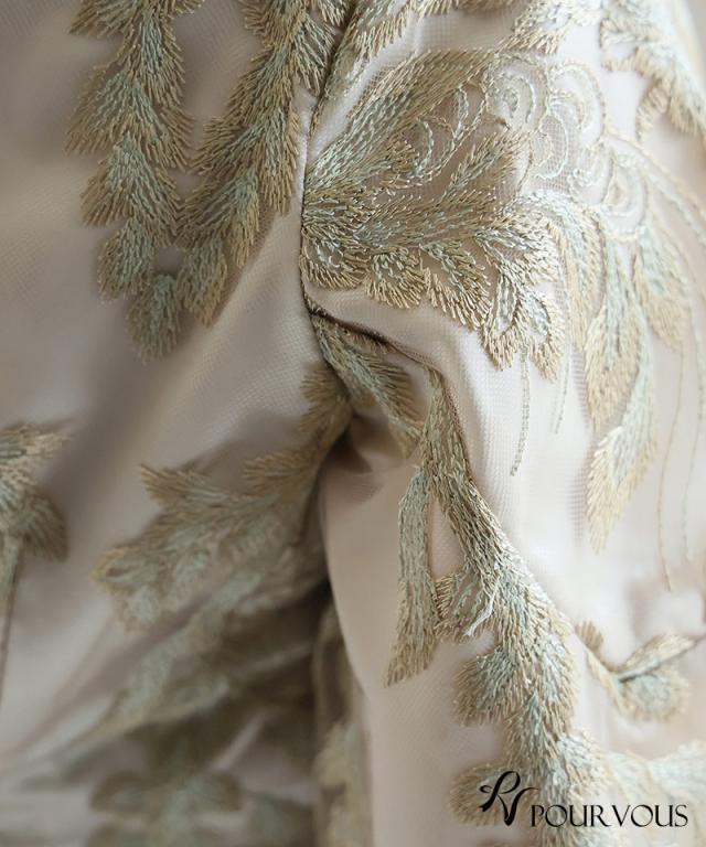 リーフ刺繍が目を惹くデザインのドレス。