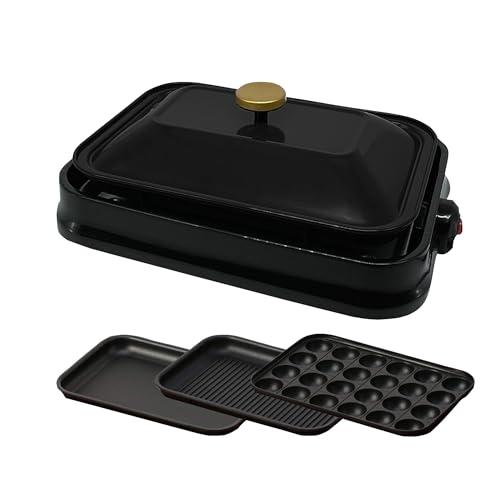 [東京Deco] 3WAY コンパクトホットプレート ブラック 本体 プレート3種 (たこ焼き グリル 平面) 3way 茶 これ1台 一台 蓋 ふた付き 800w 温度 1人 2人 3人 用 小型 ひとり暮らし にも A4 サイズ スタ