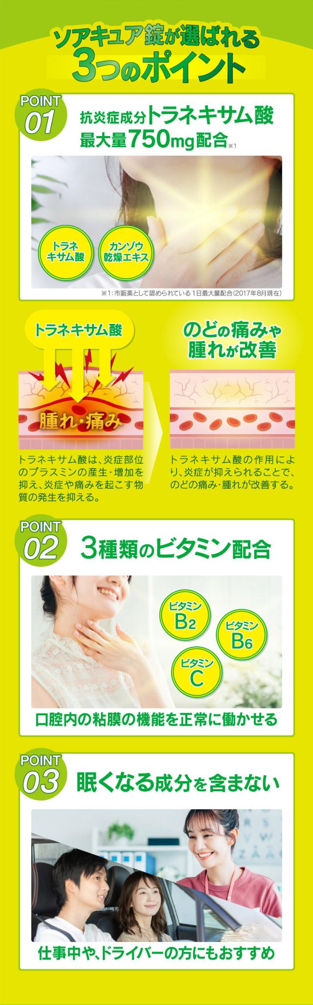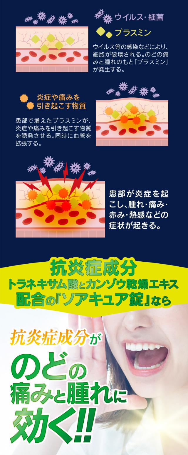 ソアキュア錠は、抗炎症剤のトラネキサム酸を配合しています。炎症のもとに作用して、痛み・はれを鎮めるお薬です。