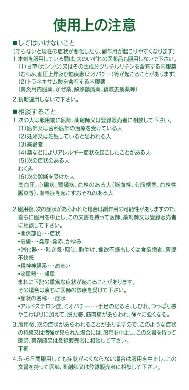 | 使用上の注意 | ■してはいけないこと (守らないと現在の症状が悪化したり、副作用が起こりやすくなります) 【1】本剤を服用している間は、次のいずれの医薬品も使用しないでください (1)甘草(カンゾウ)又はその主成分グリチルリチンを含有する内服薬(むくみ、血圧上昇及び筋疾患(ミオパチー)等が起こることがあります。)。 (2)トラネキサム酸を含有する内服薬(鼻炎用内服薬、かぜ薬、解熱鎮痛薬、鎮咳去痰薬等)。 【2】長期連用しないでください ■相談すること 【1】次の人は服用前に医師、薬剤師又は登録販売者に相談してください (1)医師又は歯科医師の治療を受けている人。 (2)妊婦又は妊娠していると思われる人。 (3)高齢者。 (4)薬などによりアレルギー症状を起こしたことがある人。 (5)次の症状のある人。むくみ (6)次の診断を受けた人。高血圧、心臓病、腎臓病、血栓のある人(脳血栓、心筋梗塞、血栓性静脈炎等)、血栓症を起こすおそれのある人 【2】服用後、次の症状があらわれた場合は副作用の可能性があるので、直ちに服用を中止し、この文書を持って医師、薬剤師又は登録販売者に相談してください