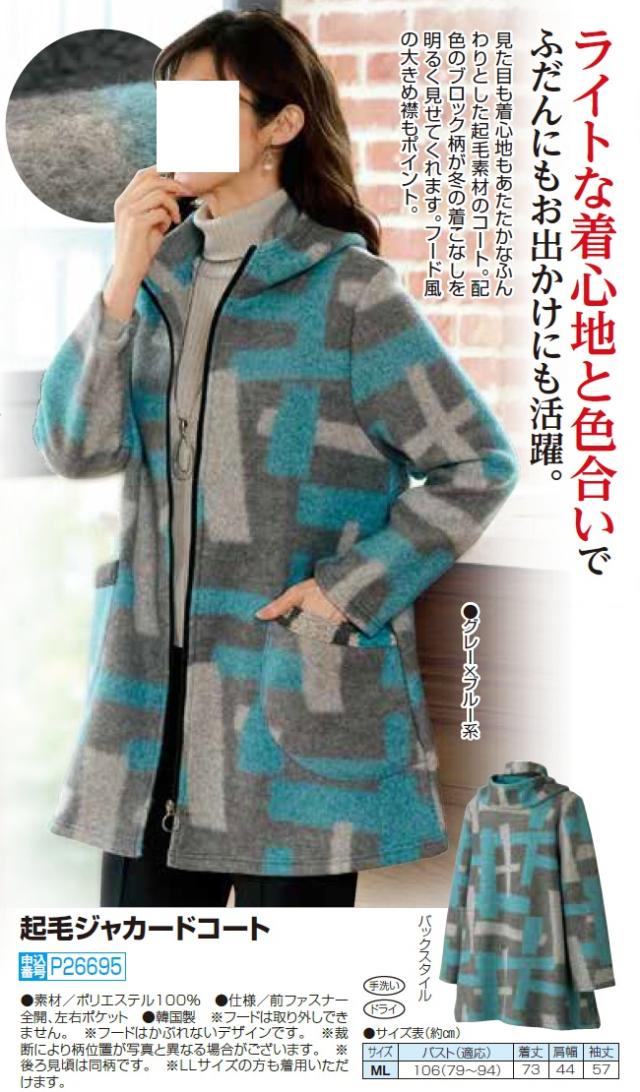 ハーフコート 起毛 コート レディース 冬 きれいめ 起毛ジャカードコート グレー ブルー ミドル丈 婦人服 ミセス シニア 女性 ブロック柄 おしゃれ ジップアップ ファスナー ジャケット シニアファッション 40代 50代 60代 70代 80代 母の日 お母さん 秋冬 nss p26695