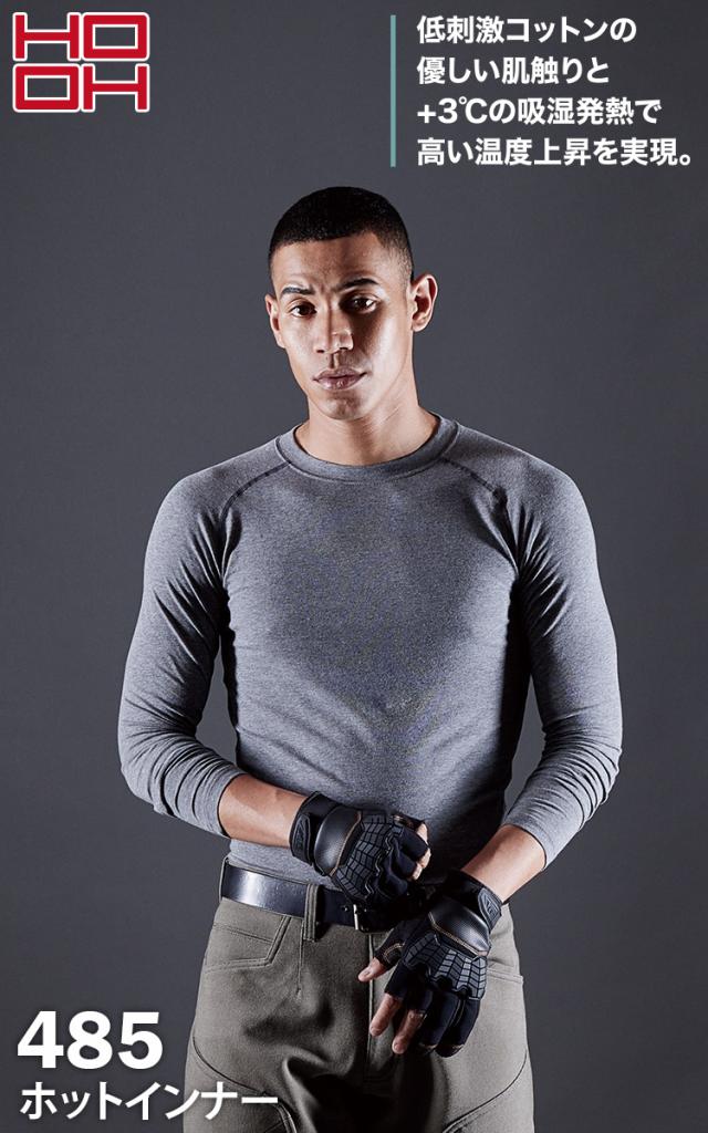 村上被服 鳳皇 HOOH 485 大きいサイズ 6L 8L ホットインナー コンプレッション アンダーシャツ ストレッチ 低刺激コットン 裏微起毛 UVカット 発熱 秋冬用 ワークユニフォーム 土木 工事 現場 S~5L メンズ 作業服 作業着