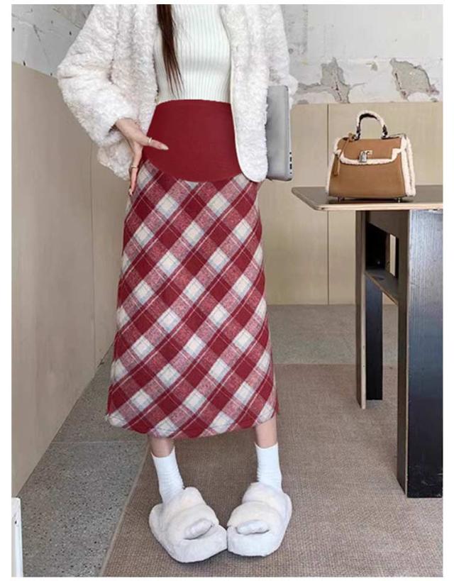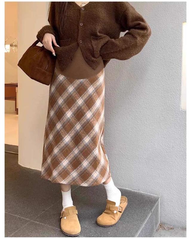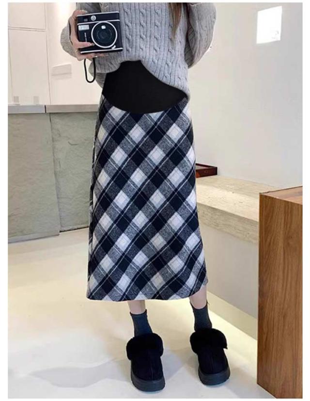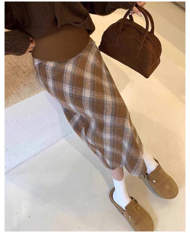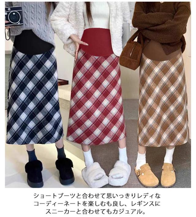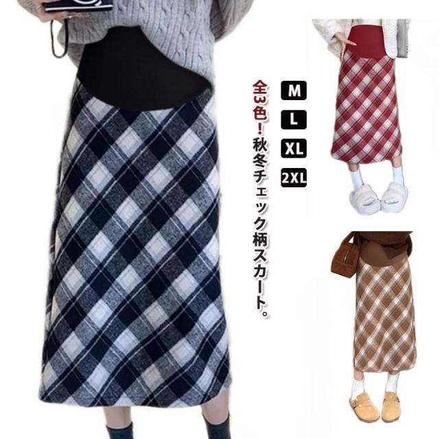 マタニティ チェックスカート ミモレ丈 チェック柄 ロングスカート ペンシルスカート ハイウェスト マタニティ かわいい アジャスター付き おしゃれ 体型カバー 春 レトロ バックスリット 秋 冬 M L XL