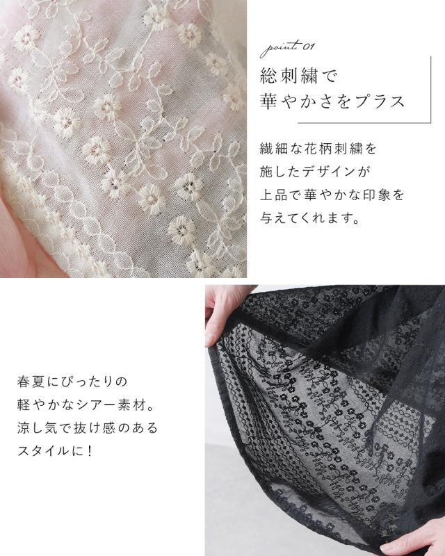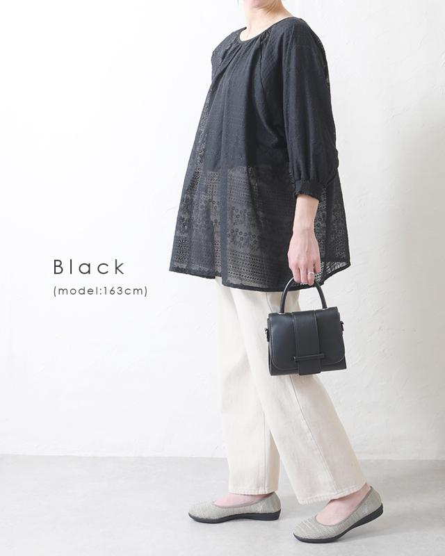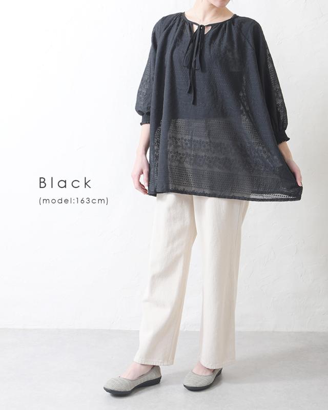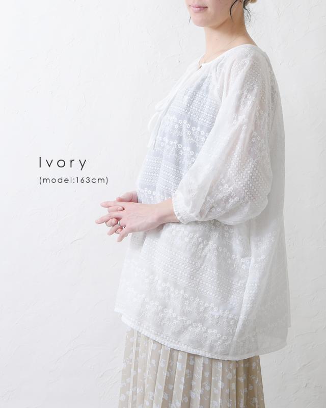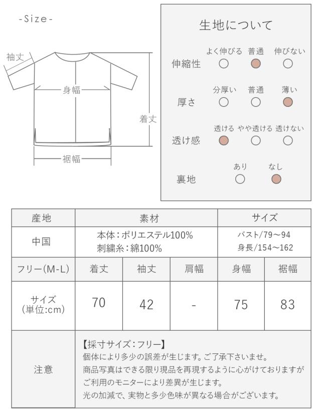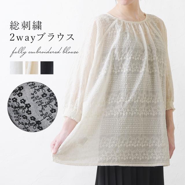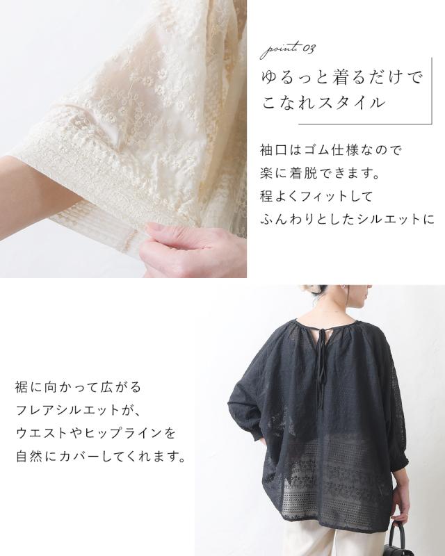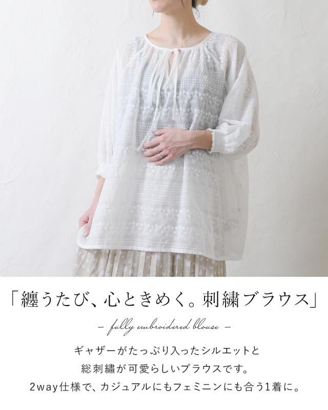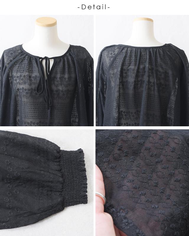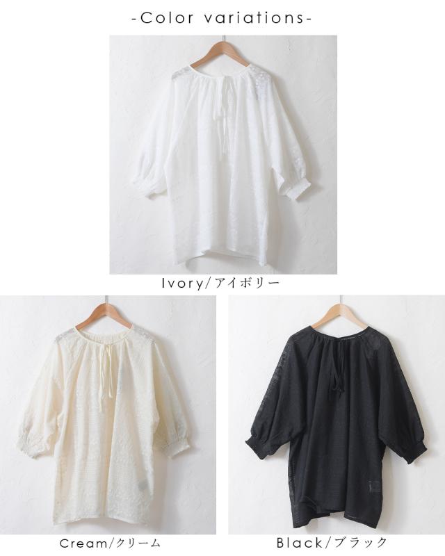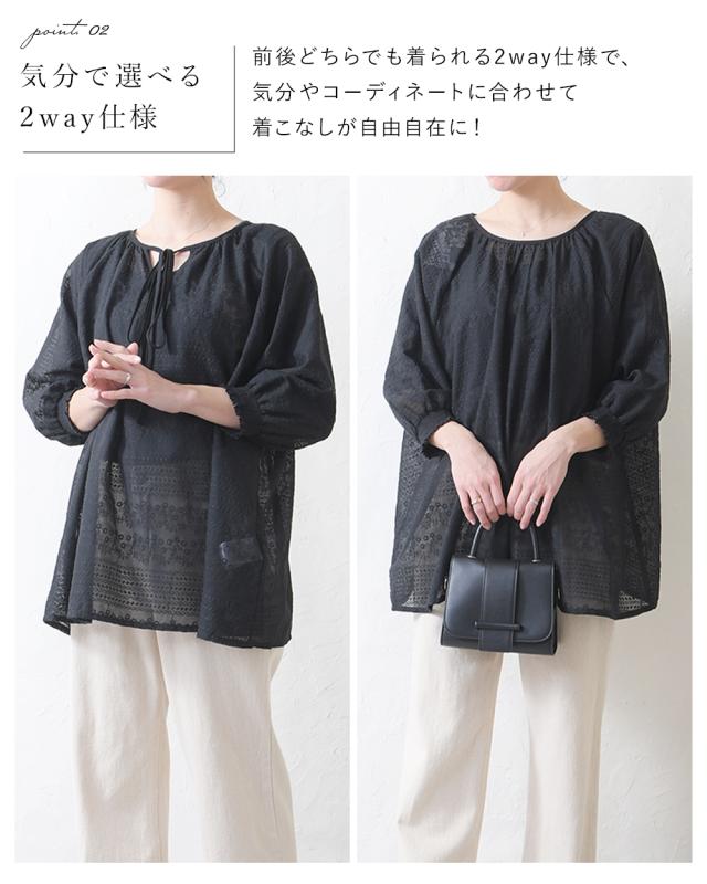 【メール便可】ブラウス レディース トップス 七分袖 五分袖 刺繍 ギャザー プルオーバー シアー 前後着用 2way フェミニン カジュアル オフィス ゆったり 大人可愛い 大人 ナチュラル 無地 おしゃれ 黒 白 春 夏